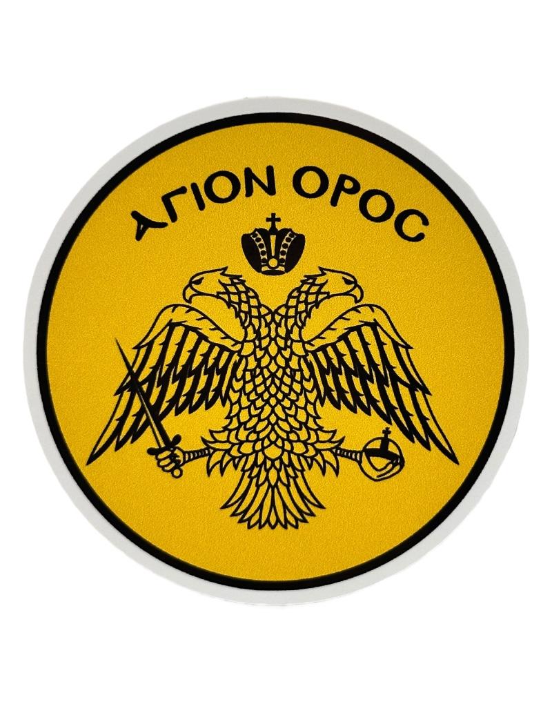 Στρογγυλό κίτρινο αυτοκόλλητο με θέμα το Άγιον Όρος και σχέδιο δικέφαλου αετού στο κέντρο.