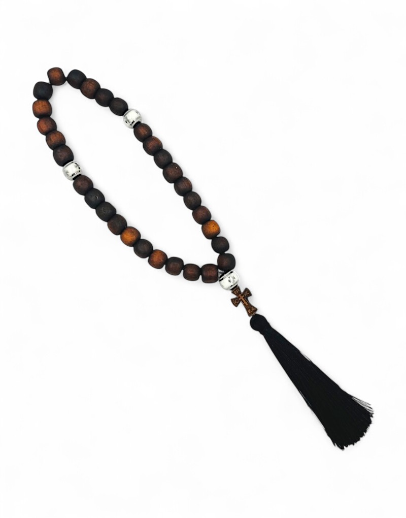 Ένα αυθεντικό αγιορείτικο κομποσχοίνι με 33 ξύλινες χάντρες, ξύλινο σταυρό και φούντα στο τελείωμα, φτιαγμένο με φροντίδα και παραδοσιακή τεχνική. Κατάλληλο για να κρεμιέται στο αυτοκίνητο, στο σπίτι, ή όπου αλλού επιθυμείτε.