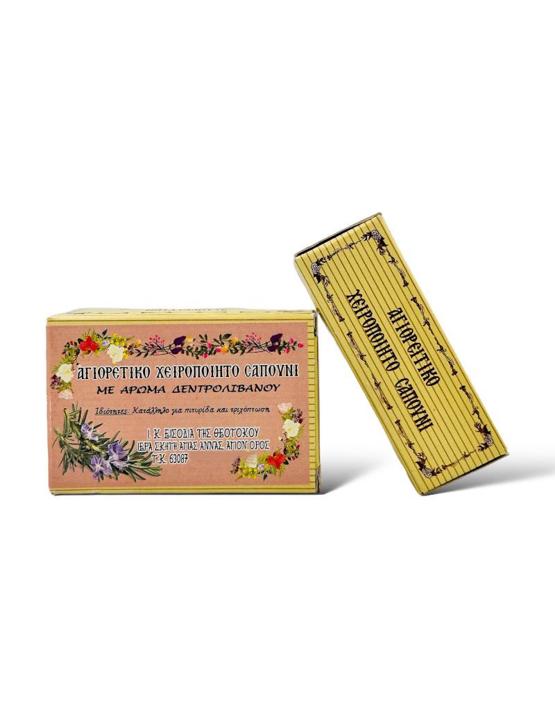 Αγιορείτικο αγνό σαπούνι με άρωμα Δενδρολίβανου το οποίο κατασκευάζεται από τους μοναχούς του Ιερού Κελίου Εισόδια της Θεοτόκου, της Ιεράς Σκήτης Αγίας Άννης Αγίου Όρους. Οι μοναχοί με μεράκι και αγάπη συλλέγουν αγνές πρώτες ύλες οι οποίες χρησιμοποιούνται για την κατασκευή φυσικών, ευεργετικών και άριστης ποιότητας προϊόντων.