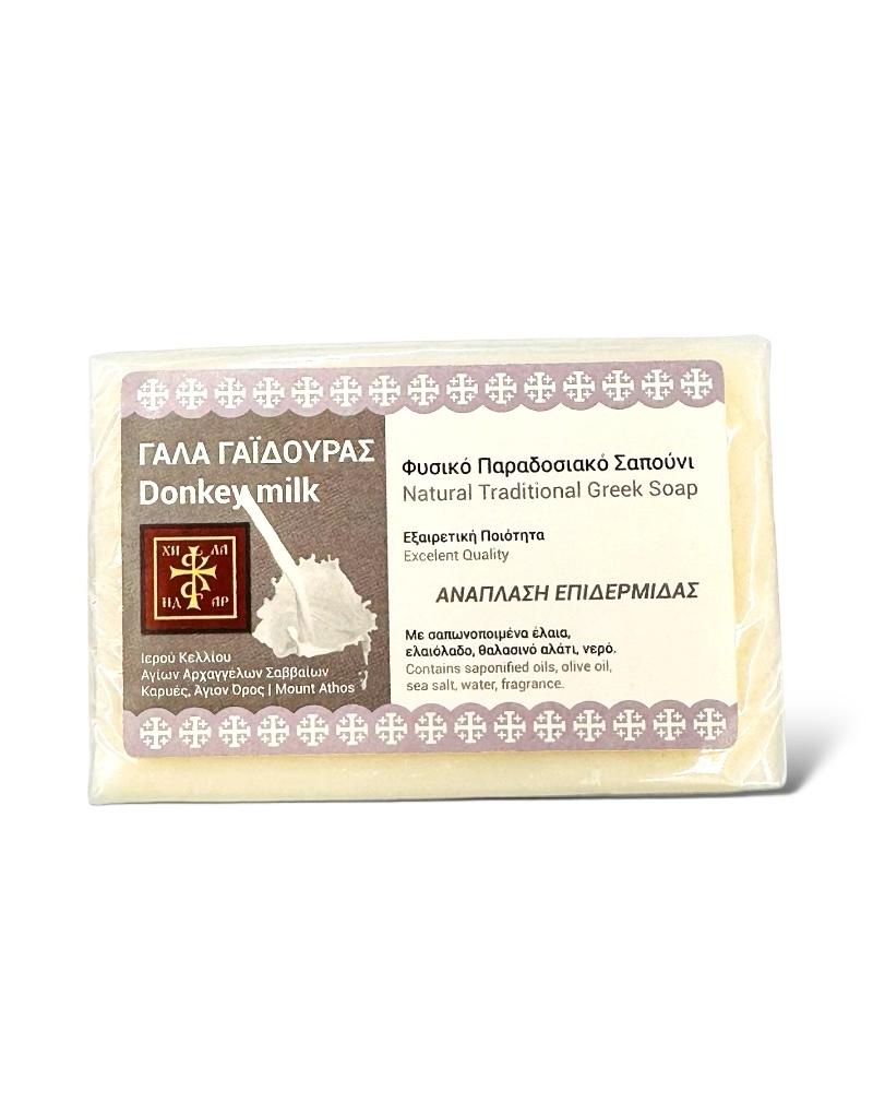Αγιορείτικο σαπούνι με Γάλα Γαϊδούρας το οποίο κατασκευάζεται από τους μοναχούς του Ιερού Κελίου Αγίων Αρχαγγέλων Σαββαιών Αγίου Όρους. Οι μοναχοί με μεράκι και αγάπη συλλέγουν αγνές πρώτες ύλες οι οποίες χρησιμοποιούνται για την κατασκευή φυσικών, ευεργετικών και άριστης ποιότητας προϊόντων.