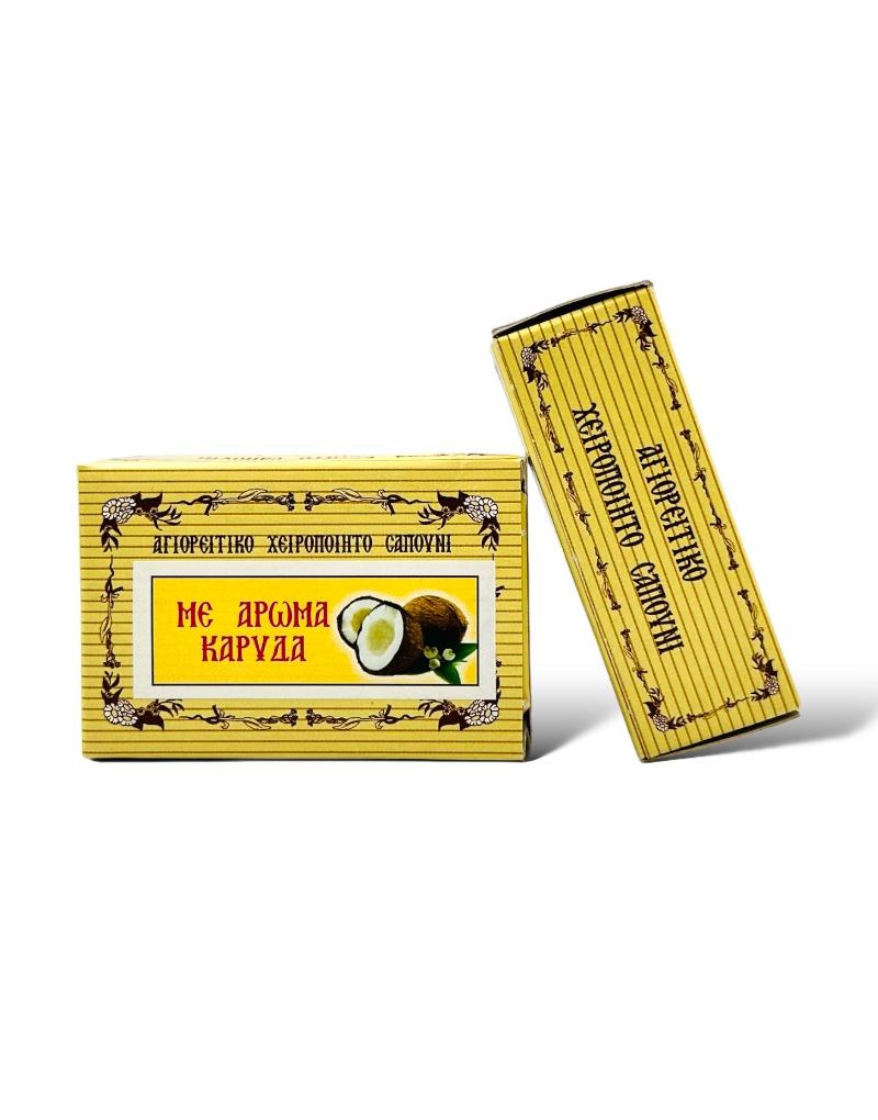 Αγιορείτικο αγνό σαπούνι με άρωμα Καρύδα το οποίο κατασκευάζεται από τους μοναχούς του Ιερού Κελίου Εισόδια της Θεοτόκου, της Ιεράς Σκήτης Αγίας Άννης Αγίου Όρους. Οι μοναχοί με μεράκι και αγάπη συλλέγουν αγνές πρώτες ύλες οι οποίες χρησιμοποιούνται για την κατασκευή φυσικών, ευεργετικών και άριστης ποιότητας προϊόντων.