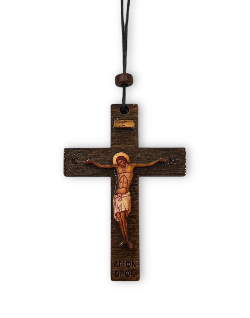 Χειροποίητος ξύλινος σταυρός αυτοκινήτου, κατασκευασμένος στις Καρυές του Αγίου Όρους. Φέρει την ιερή μορφή του Εσταυρωμένου και είναι σκαλισμένος με την επιγραφή “Άγιον Όρος”. Ένα αυθεντικό αγιορείτικο φυλαχτό που προσφέρει πνευματική προστασία και ευλογία σε κάθε διαδρομή. Ιδανικό για ανάρτηση στον καθρέφτη του αυτοκινήτου, αποτελεί ένα μοναδικό δώρο για κάθε πιστό και προσκυνητή.