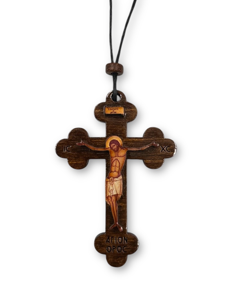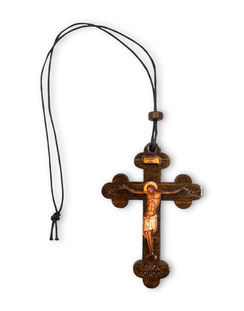 Χειροποίητος ξύλινος σταυρός αυτοκινήτου, κατασκευασμένος στις Καρυές του Αγίου Όρους. Φέρει την ιερή μορφή του Εσταυρωμένου και είναι σκαλισμένος με την επιγραφή “Άγιον Όρος”. Ένα αυθεντικό αγιορείτικο φυλαχτό που προσφέρει πνευματική προστασία και ευλογία σε κάθε διαδρομή. Ιδανικό για ανάρτηση στον καθρέφτη του αυτοκινήτου, αποτελεί ένα μοναδικό δώρο για κάθε πιστό και προσκυνητή.