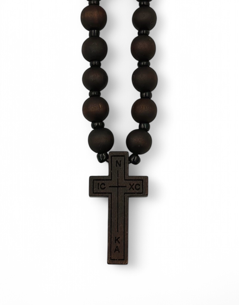 Αγιορείτικος Ξύλινος Σταυρός Λαιμού ο οποίος συνδυάζει την παράδοση με την ιδιαίτερη αισθητική. Κατασκευασμένος από ξύλο υψηλής ποιότητας, με σκαλιστό σταυρό και στρογγυλές ξύλινες χάντρες, αυτός ο σταυρός φέρει τη σφραγίδα της αγιορείτικης τέχνης και πίστης.