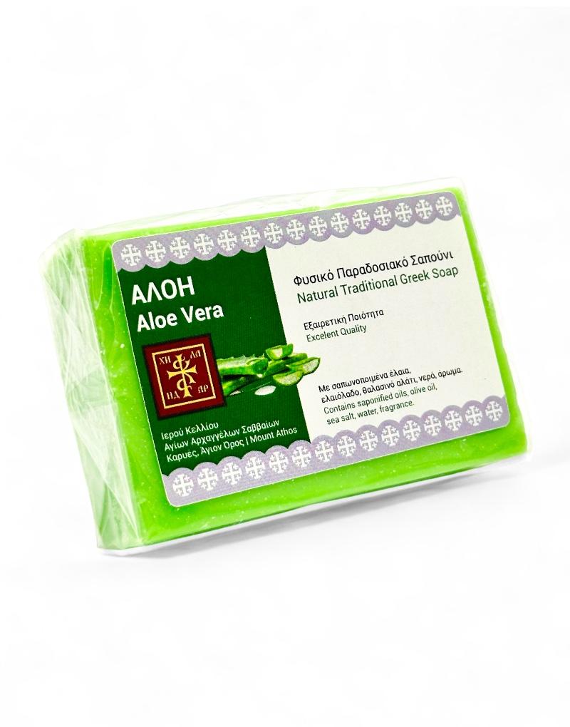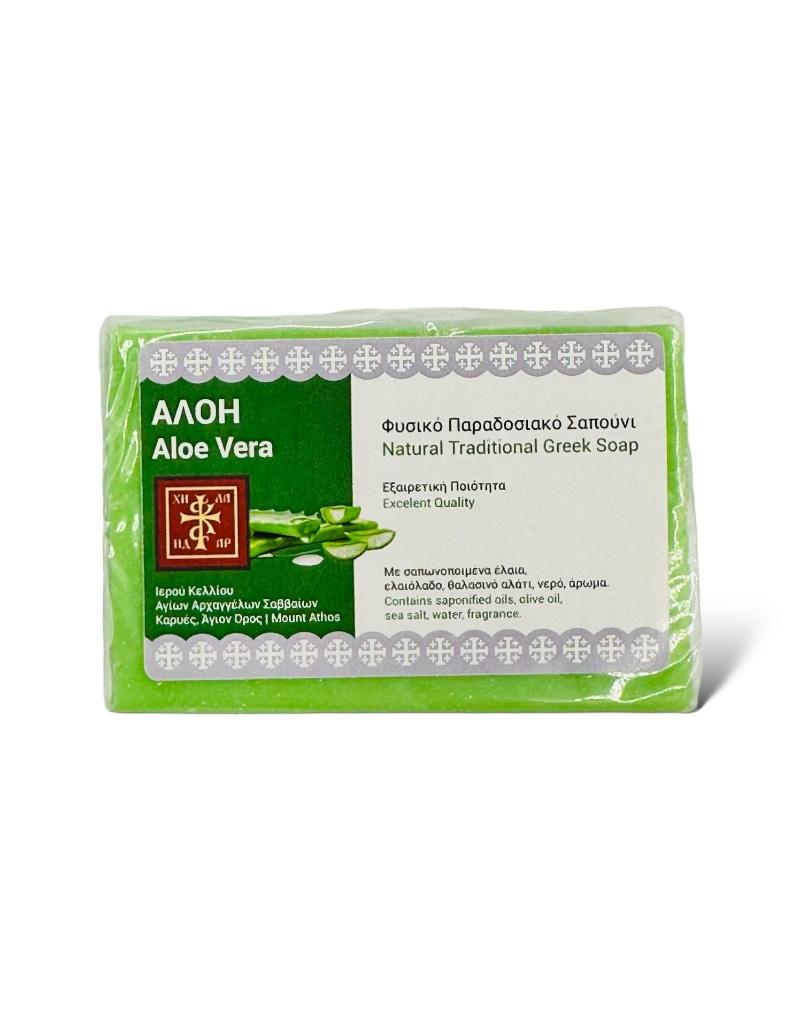Αγιορείτικο σαπούνι με αλόη το οποίο κατασκευάζεται από τους μοναχούς του Ιερού Κελίου Αγίων Αρχαγγέλων Σαββαιών Αγίου Όρους. Οι μοναχοί με μεράκι και αγάπη συλλέγουν αγνές πρώτες ύλες οι οποίες χρησιμοποιούνται για την κατασκευή φυσικών, ευεργετικών και άριστης ποιότητας προϊόντων.