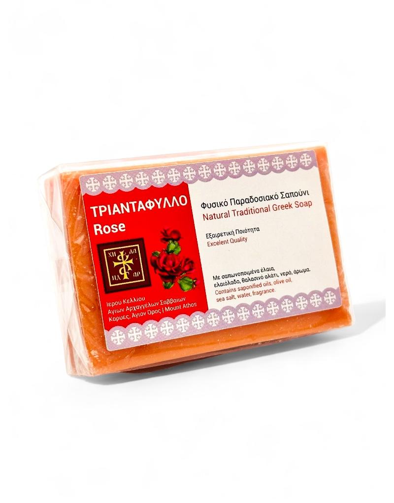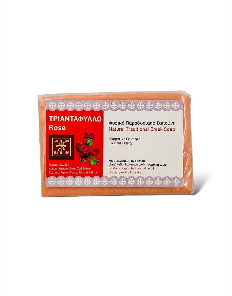 Αγιορείτικο σαπούνι Τριαντάφυλλο το οποίο κατασκευάζεται από τους μοναχούς του Ιερού Κελίου Αγίων Αρχαγγέλων Σαββαιών Αγίου Όρους. Οι μοναχοί με μεράκι και αγάπη συλλέγουν αγνές πρώτες ύλες οι οποίες χρησιμοποιούνται για την κατασκευή φυσικών, ευεργετικών και άριστης ποιότητας προϊόντων.