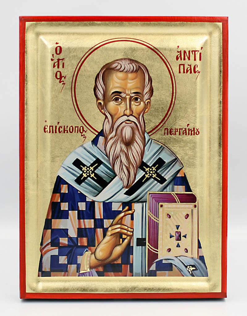 Μυροβλύτην τον θείον και μαρτύρων τον σύναθλον, τον πανευκλεή ιεράρχην και Περγάμου τον πρόεδρον, τιμήσωμεν Αντίπαν οι πιστοί, ως τάχιστον και μέγαν ιατρόν, της δεινής οδόντων νόσου, και προς αυτόν από ψυχής βοήσωμεν· Δόξα τω σε δοξάσαντι Χριστώ, δόξα τω σε στεφανώσαντι, δόξα τω ενεργούντι δια σου πάσιν ιάματα.
