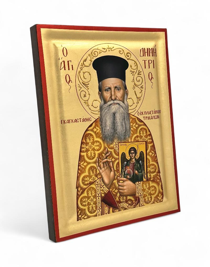 Ο Άγιος Δημήτριος Γκαγκαστάθης ὁ ἐκ Πλατάνου Τρικάλων σε μια μοναδική χειροποίητη ένσκαπτη εικόνα μεταξοτυπίας εκτυπωμένη πάνω σε επιχρυσωμένο καμβά.