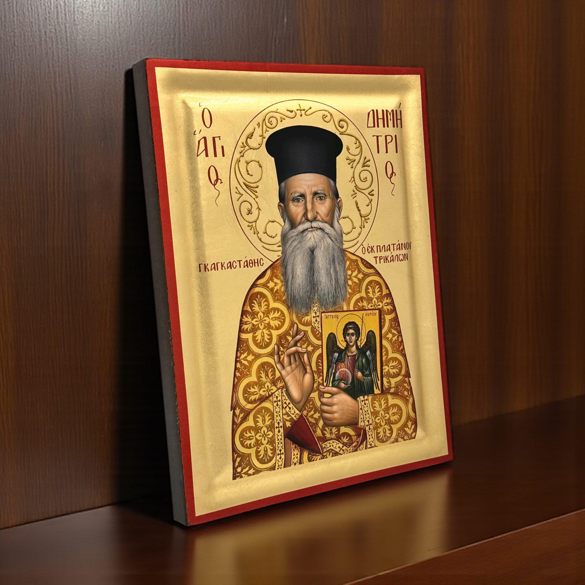 Ο Άγιος Δημήτριος Γκαγκαστάθης ὁ ἐκ Πλατάνου Τρικάλων σε μια μοναδική χειροποίητη ένσκαπτη εικόνα μεταξοτυπίας εκτυπωμένη πάνω σε επιχρυσωμένο καμβά.