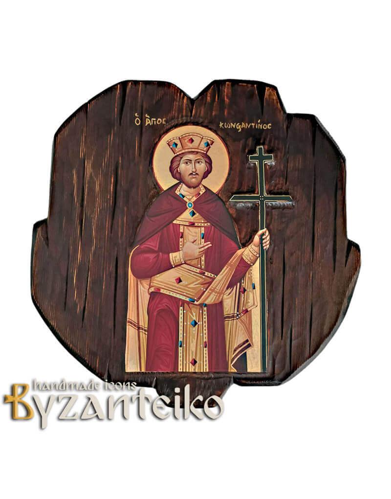 Μοναδική ξυλόγλυπτη εικόνα, χειροποίητη και σκαλισμένη με σκαρπέλο. Η εικόνα είναι μεταξοτυπίας εκτυπωμένη πάνω σε επιχρυσωμένο καμβά. Συνοδεύεται στο πίσω μέρος από πιστοποιητικό γνησιότητας σφραγισμένο από βουλοκέρι. Επίσης διαθέτει δερμάτινο σχοινάκι έτσι ώστε να μπορείτε εύκολα να κρεμάσετε την εικόνα. Ως γενέτειρα πόλη του Μεγάλου Κωνσταντίνου αναφέρεται τόσο η Ταρσός της Κιλικίας όσο και το Δρέπανο της Βιθυνίας. Ωστόσο η άποψη που επικρατεί φέρει τον Μέγα Κωνσταντίνο να έχει γεννηθεί στη Ναϊσό της Άνω Μοισίας (σημερινή Νις της Σερβίας). Το ακριβές έτος της γεννήσεώς του δεν είναι γνωστό, θεωρείται όμως ότι γεννήθηκε μεταξύ των ετών 272-288 μ.Χ. Μία ωμοπλάτη του Αγίου Κωνσταντίνου βρίσκεται στη Μονή Κωνσταμονίτου Αγίου Όρους. Αποτμήματα του Ιερού Λειψάνου του Αγίου Κωνσταντίνου βρίσκονται στη Μονή Κύκκου Κύπρου και στις Λαύρες Αγίας Τριάδος – Αγ. Σεργίου Μόσχας και Αγ. Αλεξάνδρου Νέβσκι Αγίας Πετρουπόλεως. Η μνήμη του τιμάται από την Ορθόδοξη Εκκλησία στις 21 Μαΐου.