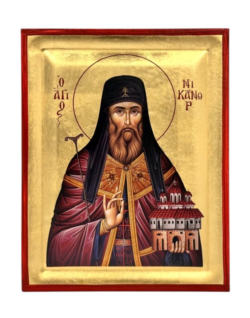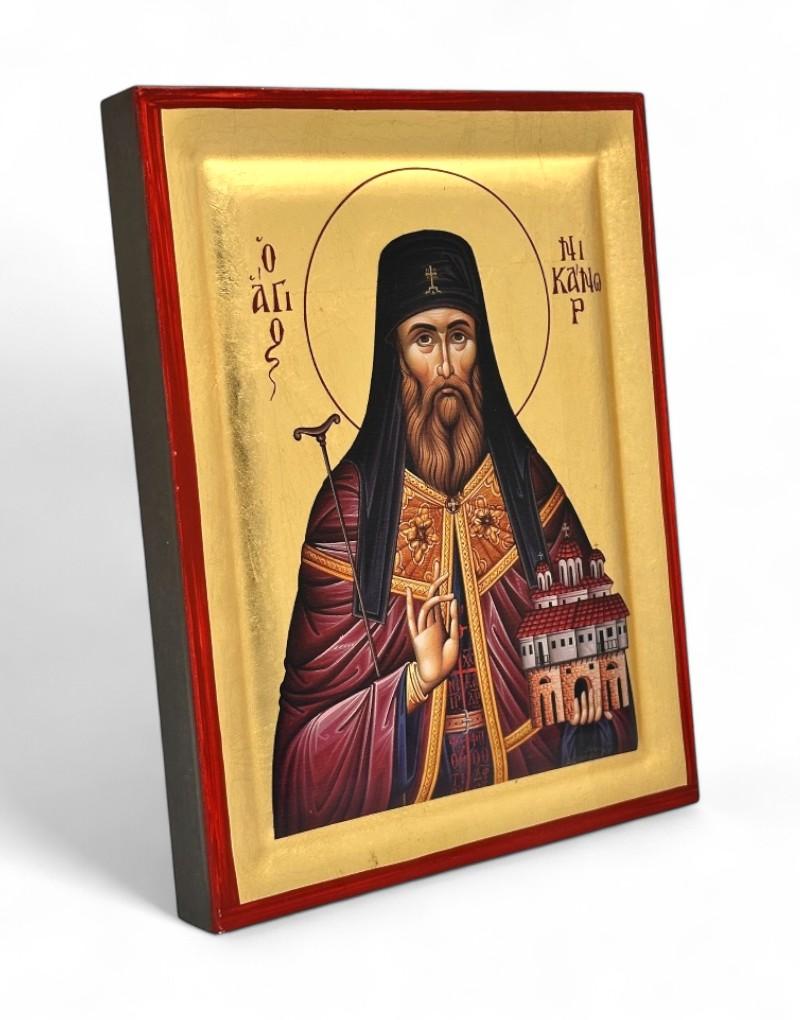 Ο Άγιος Νικάνωρ σε μια μοναδική χειροποίητη ένσκαπτη εικόνα μεταξοτυπίας εκτυπωμένη πάνω σε επιχρυσωμένο καμβά.