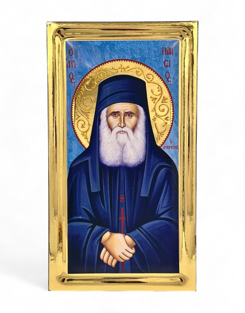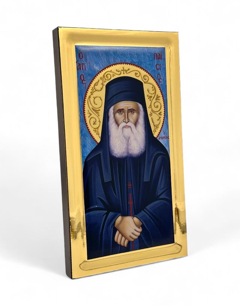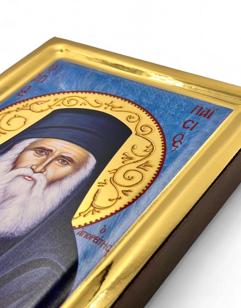 Ο Άγιος Παΐσιος ο Αγιορείτης με μπλε φόντο σε μια μοναδική χειροποίητη εικόνα με όψη στιλβωτού.