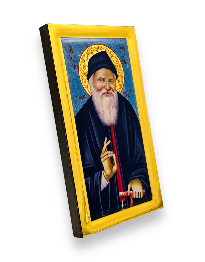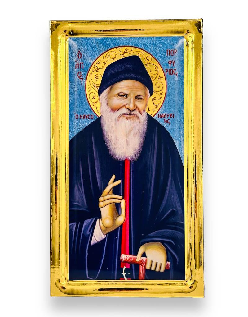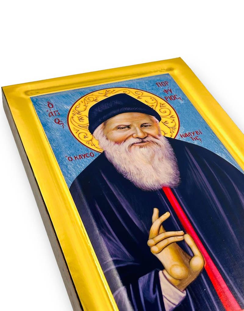 Ο Άγιος Πορφύριος ο Καυσοκαλυβίτης με μπλε φόντο σε μια μοναδική χειροποίητη εικόνα με όψη στιλβωτού.
