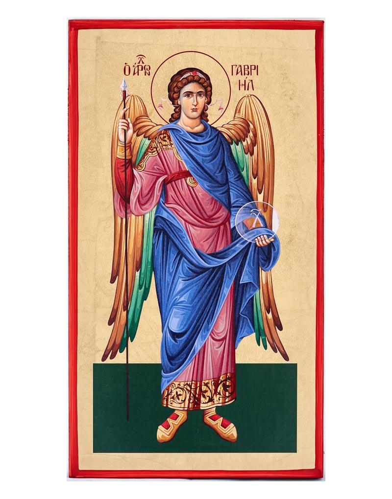 Ο Αρχάγγελος Γαβριήλ σε μια μοναδική χειροποίητη επίπεδη εικόνα μεταξοτυπίας εκτυπωμένη πάνω σε επιχρυσωμένο καμβά. Συνοδεύεται στο πίσω μέρος από πιστοποιητικό γνησιότητας σφραγισμένο από βουλοκέρι. Επίσης διαθέτει δερμάτινο σχοινάκι έτσι ώστε να μπορείτε να κρεμάσετε την εικόνα.