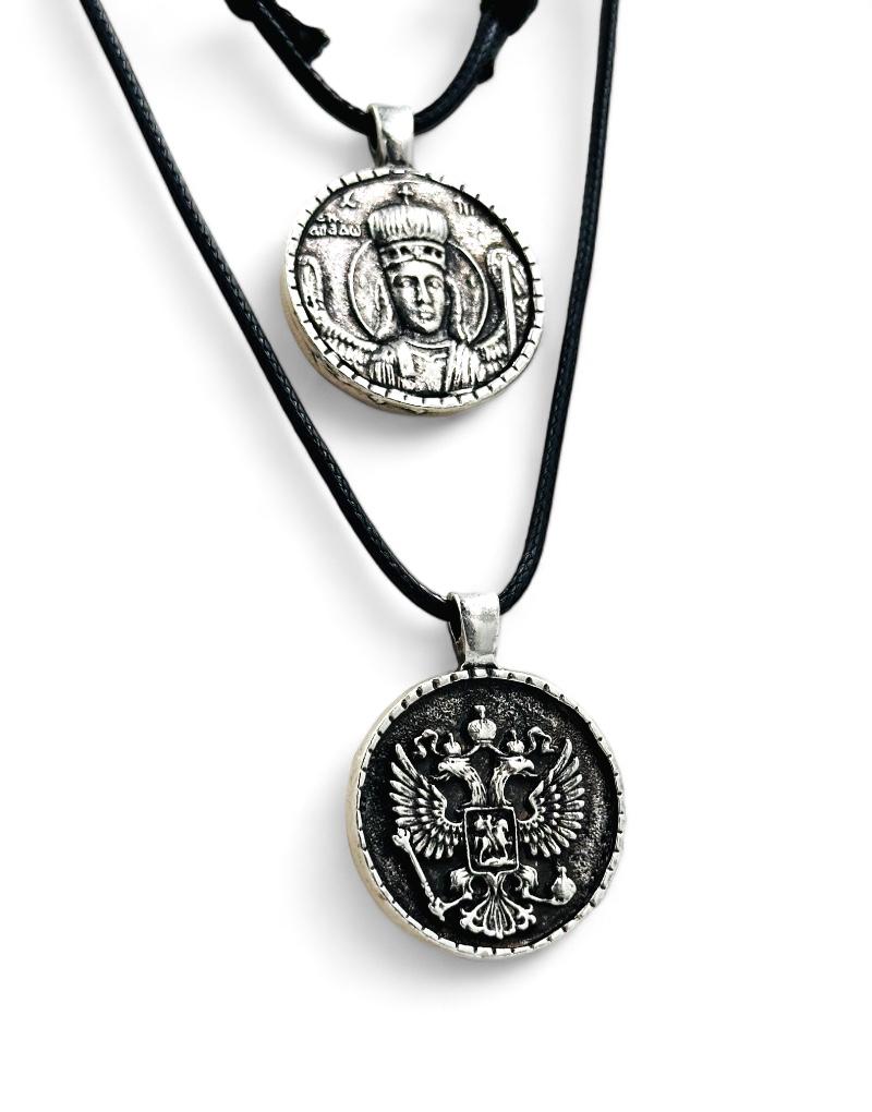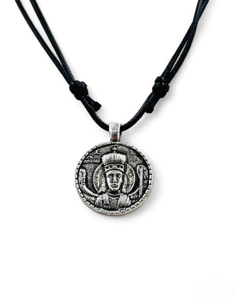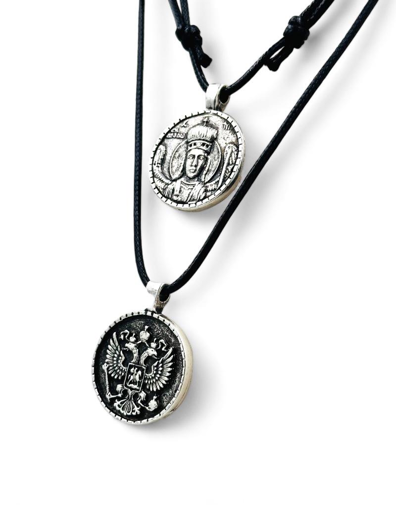 Χειροποίητο επάργυρο μενταγιόν λαιμού, με τον Ταξιάρχη Μιχαήλ Μανταμάδος στη μία πλευρά και τον Βυζαντινό Δικέφαλο Αετό στην άλλη, και μαύρο ρυθμιζόμενο κορδόνι για να προσαρμόζεται σε κάθε λαιμό στο μέγεθος που επιθυμείτε.