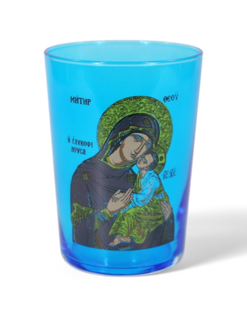 Προσθέστε μία ιερή και κατανυκτική ατμόσφαιρα στον χώρο σας με αυτό το υπέροχο επιτραπέζιο καντήλι ποτήρι σε μπλε χρώμα, διακοσμημένο με εικόνα της Παναγίας μέσω της τεχνικής της χαλκομανίας. Πρόκειται για ένα αυθεντικό ελληνικό χειροποίητο προϊόν, ιδανικό για προσωπική προσευχή ή εκκλησιαστική χρήση.
