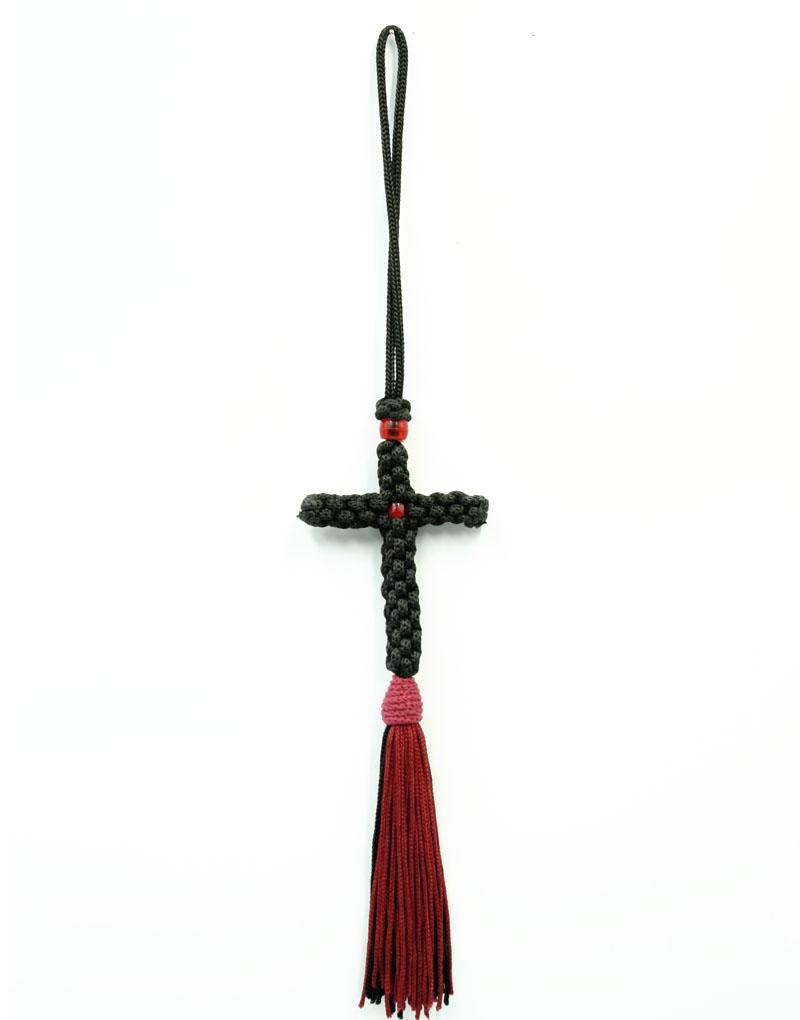 Φυλαχτό Κρεμαστό αυτοκινήτου με πλεκτό σταυρό και μαύρη-κόκκινη φούντα