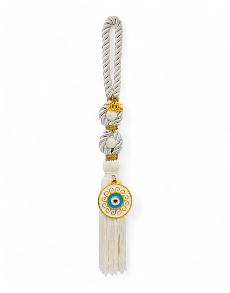 Γούρι λευκό 2025 με μάτι, φτιαγμένο με αγάπη και προσοχή στη λεπτομέρεια. Διαθέτει λευκό χρώμα, μάτι ως σύμβολο προστασίας από το κακό μάτι, χοντρό κορδόνι για σταθερότητα και αντοχή, και χάντρες πέρλα που προσθέτουν κομψότητα.