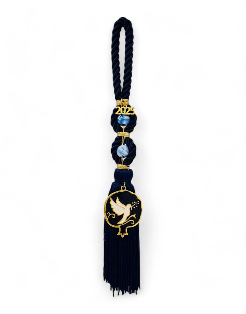 Ανακαλύψτε το μπλε γούρι μας για το 2025, φτιαγμένο με αγάπη και προσοχή στη λεπτομέρεια. Διαθέτει όμορφο μπλε χρώμα που συμβολίζει την ειρήνη και την ελπίδα, με περιστέρι που αντιπροσωπεύει την ελευθερία και την ηρεμία. Έχει χοντρό κορδόνι για σταθερότητα και αντοχή, καθώς και κομψές χάντρες πέρλα που προσθέτουν μία ξεχωριστή πινελιά.