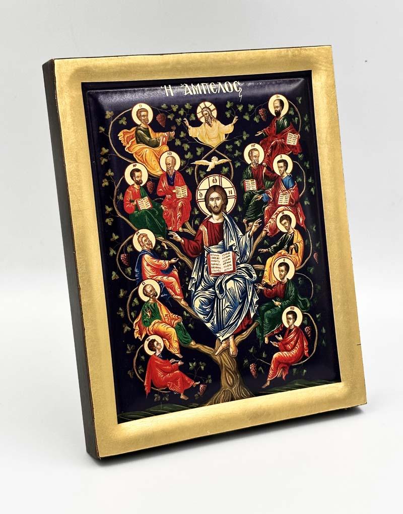 Η Άμπελος σε μια μοναδική χειροποίητη ένσκαπτη εικόνα μεταξοτυπίας εκτυπωμένη πάνω σε επιχρυσωμένο καμβά.