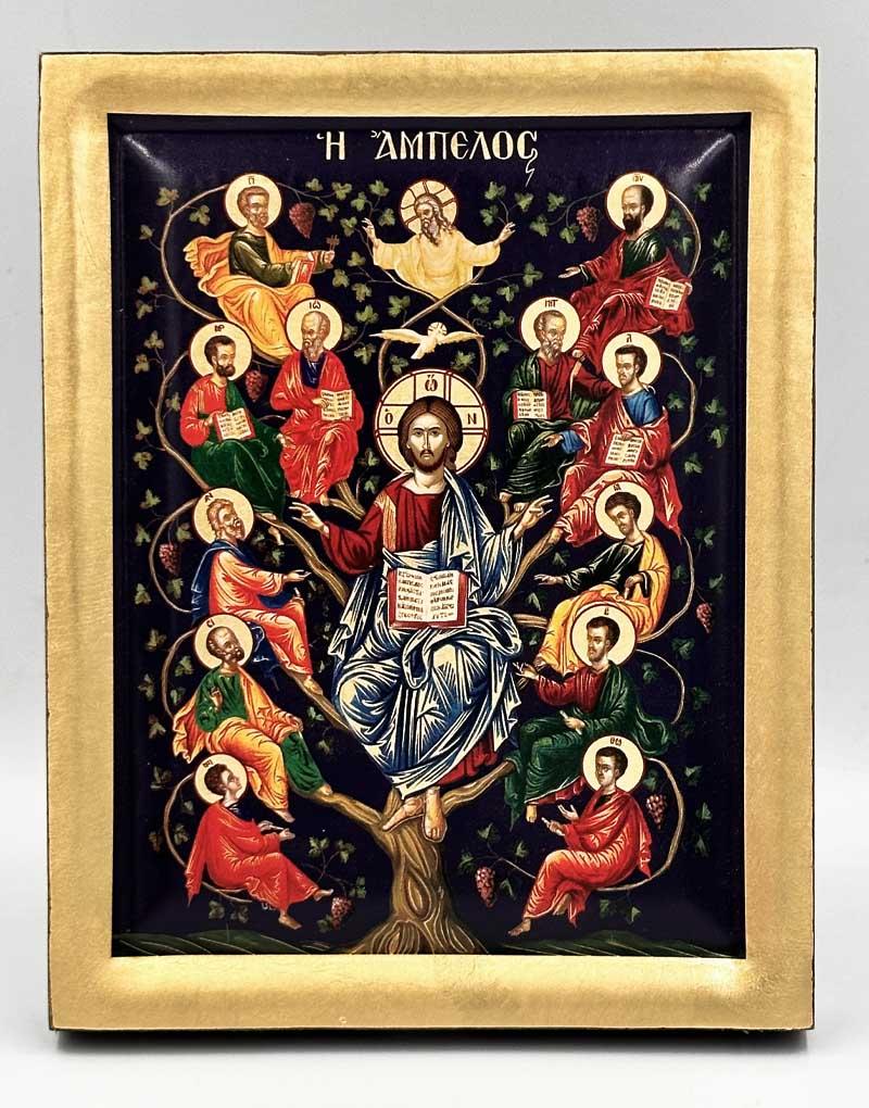 Η Άμπελος η αληθινή ο Χριστός , τα κλήματα οι Απόστολοι , διατάσσονται συμμετρικά στις κορυφές του κορμού και των κλάδων που προσφέρει στις άκρες του θρόνους με καμπυλόγραμμη ράχη στους μαθητές και στο κέντρο υποπόδιο στο Χριστό και διασταυρώνοντας με χάρη δύο κλαδιά στεφανώνει με τη δόξα των χρυσοπράσινων φύλλων τον Ιησού.