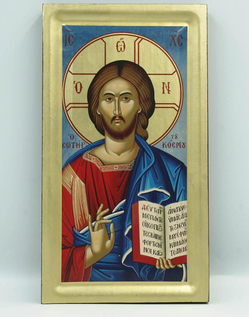 Ο Ιησούς Χριστός Σωτήρ του Κόσμου σε χειροποίητη ξύλινη εικόνα εκτυπωμένη πάνω σε καμβά με φύλλα χρυσού .