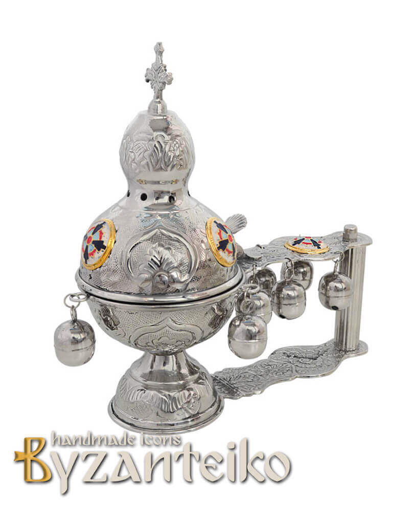 Κατζίο θυμιατό επινικελωμένο με εγχάρακτη διακόσμηση και σμαλτάκια. Ύψος: 22 cm Μήκος: 21 cm Βάρος: 0.6 kg _____________________________________________________ Το κατζίο είναι φορητό και χρησιμοποιείται στις λατρευτικές συνάξεις εντός του ναού όταν ψάλλονται ύμνοι από την Παλαιά Διαθήκη ή αναγινώσκονται οι Μεγάλες Ώρες. Έχει μακριά χειρολαβή και κουδούνια, τα οποία συμβολίζουν τα βήματα του Θεού στον Παράδεισο και προτρέπουν τους μοναχούς σε εγρήγορση :»’Και άκουσαν τη φωνή του Κυρίου του Θεού, να περπατάει στον παράδεισο προς το δειλινό» (Παλαιά Διαθήκη Γένεση Κεφ. 3, Στίχος 8.. Όταν οι εκκλησιαστικοί θυμιάζουν με το κατζίο φέρουν στον ώμο τους ένα τετράγωνο ύφασμα που λέγεται »αήρ» ΄ συνήθως είναι χρυσοποίκιλτο και δηλώνει το αγγελικό τάγμα που εξέπεσε από τη πατρώα δόξα και που αντικαταστάθηκε από τους μοναχούς. Ο εκκλησιαστικός λοιπόν κρατά το κατζίο με το »χειρομανδήλιον», το οποίο είναι μικρότερο από τον »αέρα». Ο συμβολισμός του απορρέει από την απάντηση του Αναστημένου Κυρίου »μη μου άπτου» (μην με αγγίζεις), στην Μαρία την μυροφόρο, όταν αυτή από την χαρά της ήθελε να Τον αγγίξει. (Κατά Ιωάννη Κεφ. 20, Στίχος 17..) Επειδή το θυμιατήριο συμβολίζει τις δύο φύσεις, ανθρώπινη και θεϊκή, και τις τρείς υποστάσεις Πατήρ, Υιός και Άγιο Πνεύμα και επειδή ο εκκλησιαστικός δεν έχει ιεροσύνη, πιάνει το κατζίο με το »χειρομάνδηλο» από ευλάβεια και σεμνότητα.