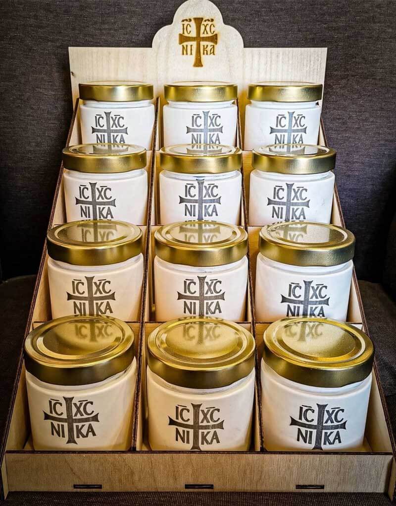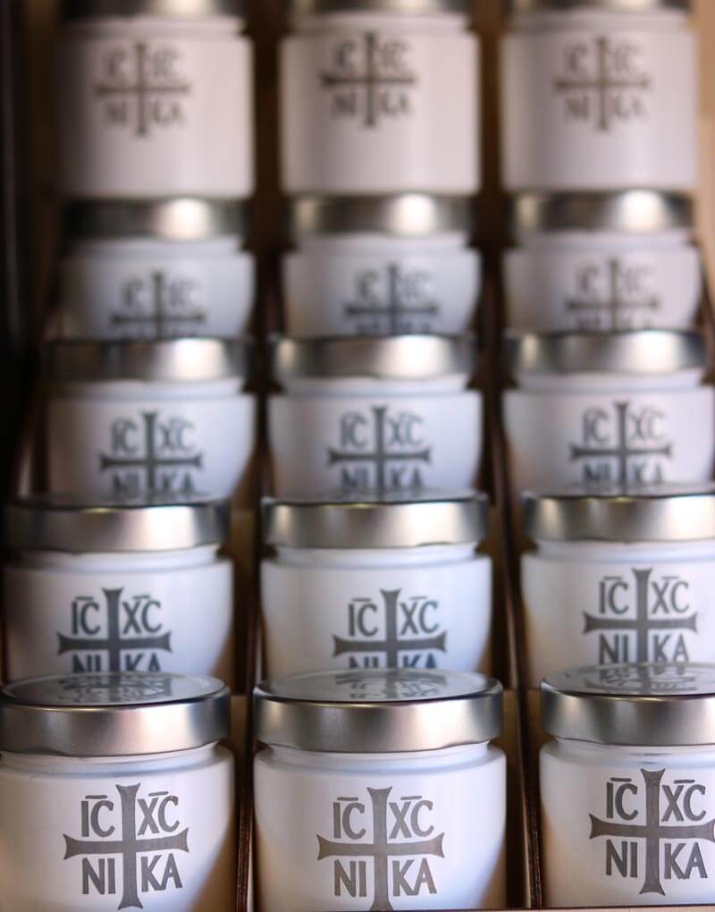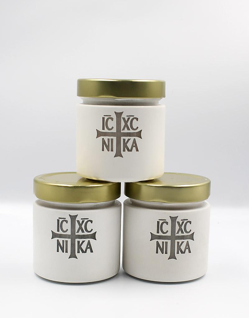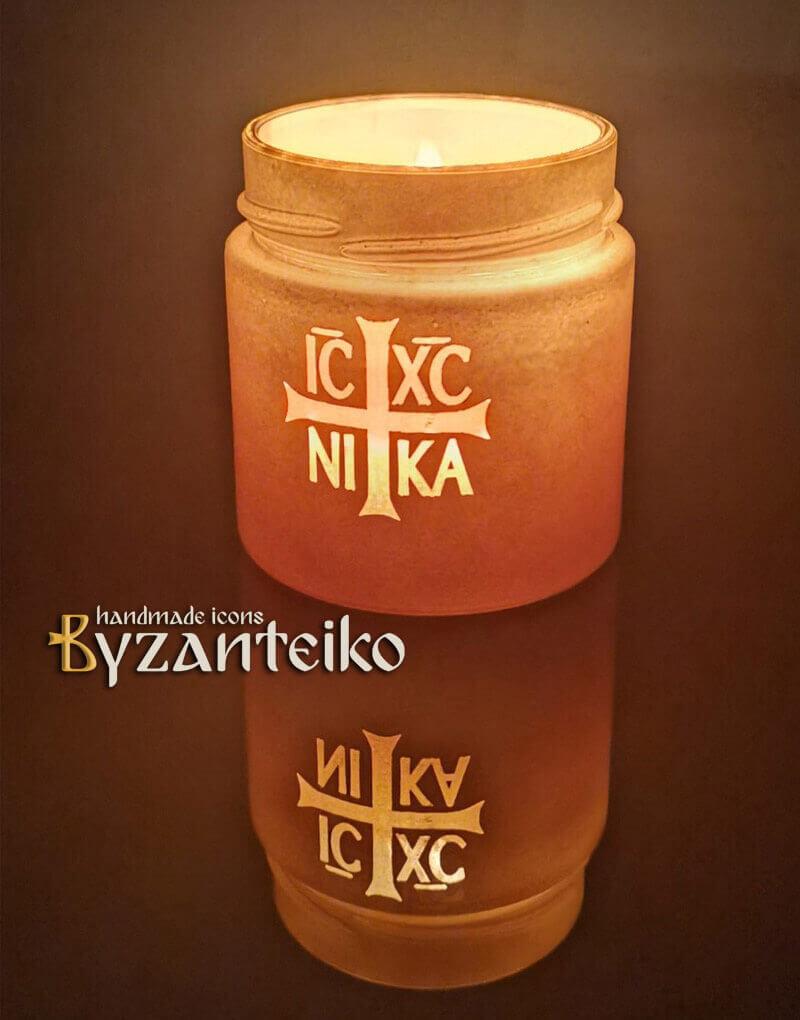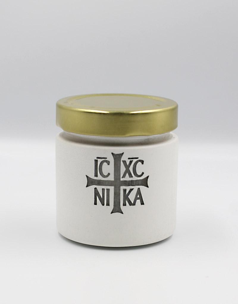 Κερί αρωματικό σε γυάλινο βαζάκι όπου είναι χαραγμένο ICXC NIKA. Το άρωμά του είναι Χερουβικό και έχει διάρκεια 40 ωρών.