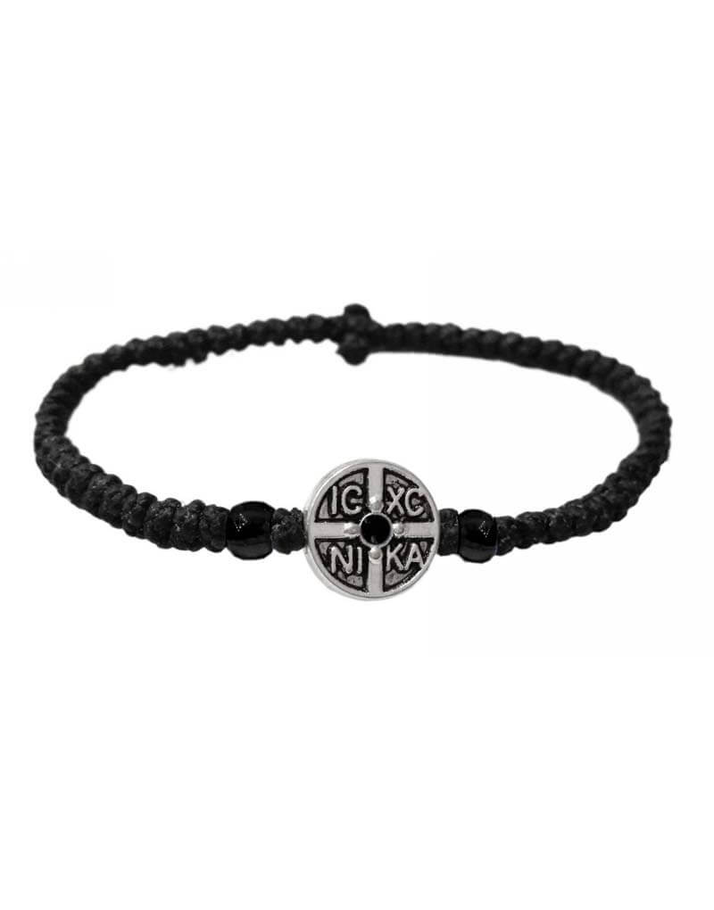 Κομποσχοίνι κερωμένο 63 κόμπων , χρώματος μαύρο με μεταλλικό Ιησούς Χριστός Νικά και μαύρη χάντρα.
