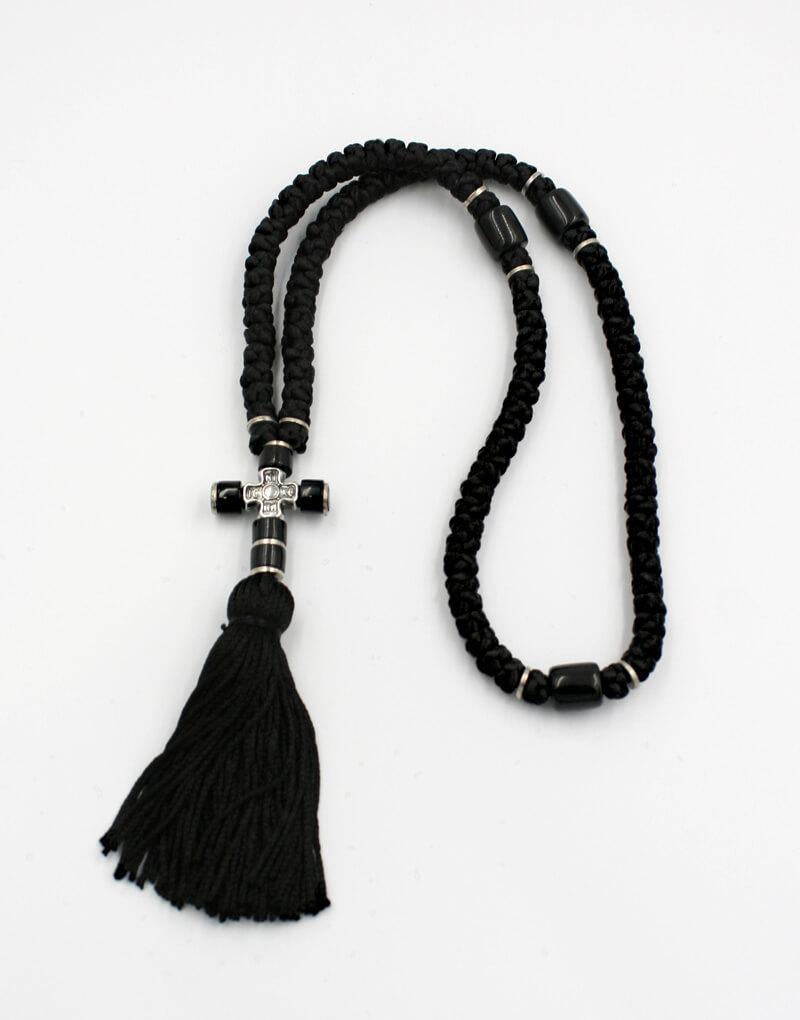 Κομποσχοίνι προσευχής 100άρι μεταξωτό με μεταλλικό σταυρό, μαύρες χάντρες και φούντα.