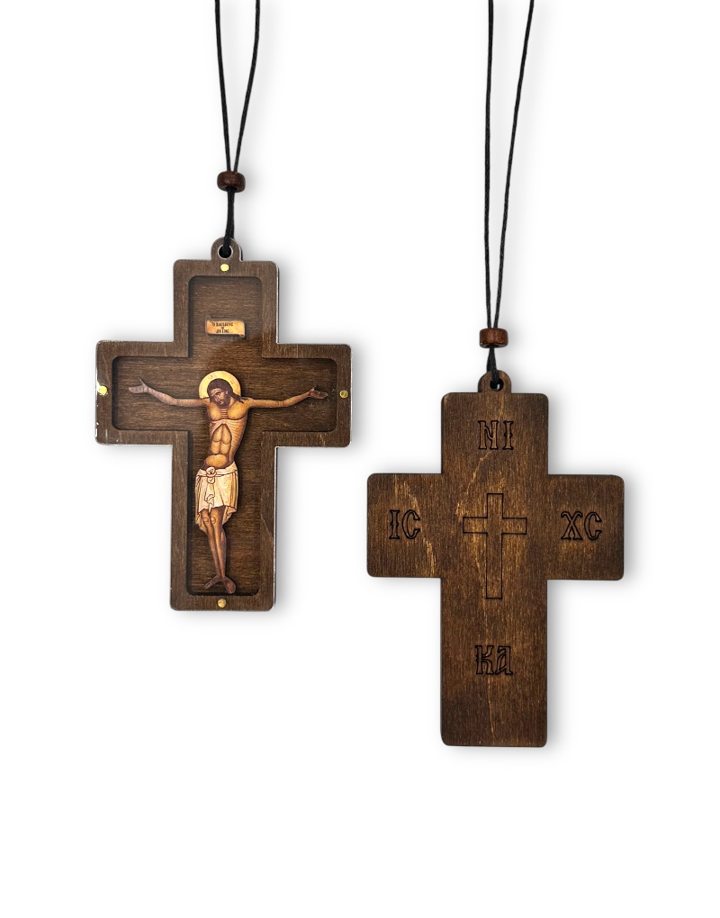 Ξύλινος κρεμαστός σταυρός αυτοκινήτου με plexiglass, διακοσμημένος με την ιερή εικόνα του Εσταυρωμένου. Στο πίσω μέρος φέρει σκαλισμένη την επιγραφή ICXC NIKA, το σύμβολο της νίκης του Χριστού. Ένα μοναδικό φυλαχτό που προσφέρει προστασία και ευλογία σε κάθε διαδρομή. Ιδανικό για ανάρτηση στον καθρέφτη του αυτοκινήτου, αποτελεί ένα ξεχωριστό δώρο για κάθε πιστό.