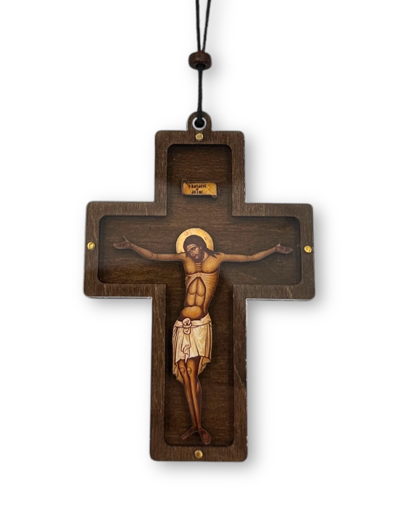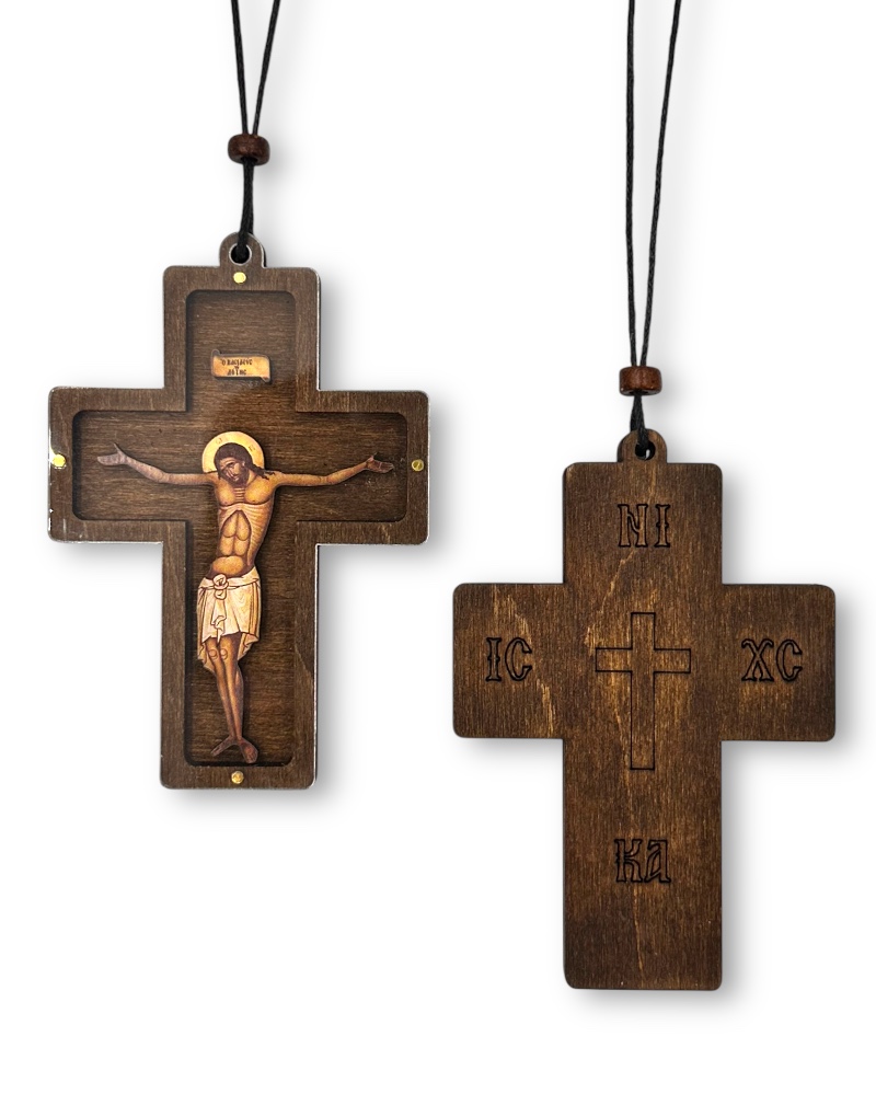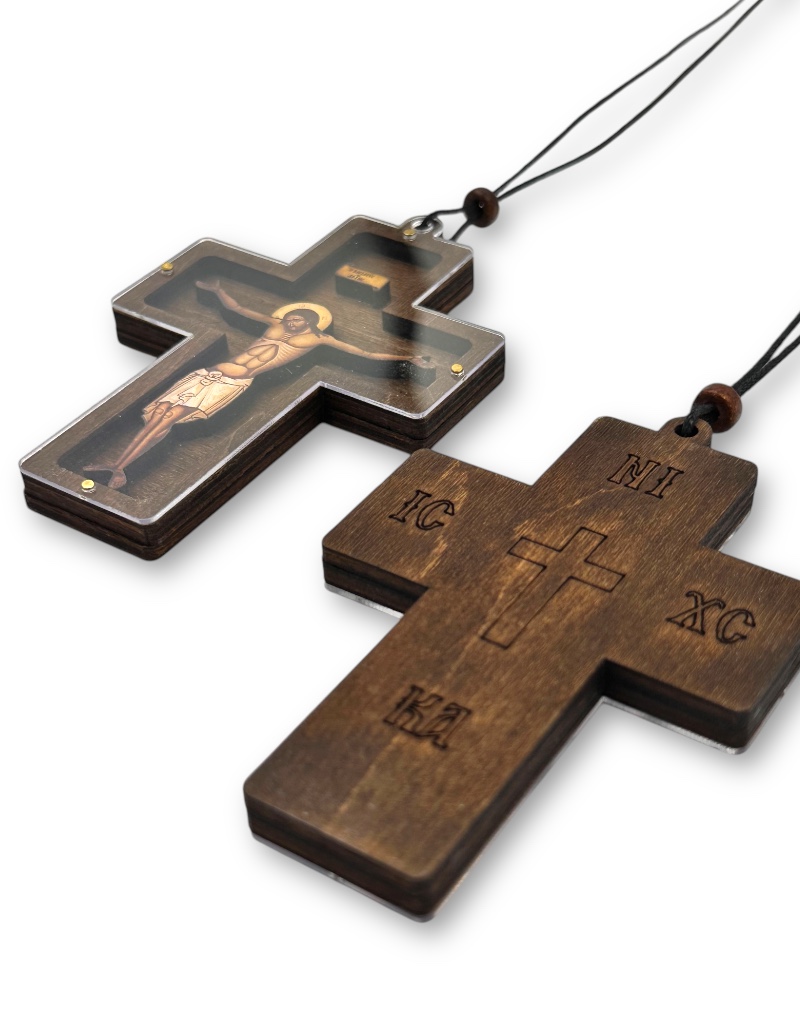 Ξύλινος κρεμαστός σταυρός αυτοκινήτου με plexiglass, διακοσμημένος με την ιερή εικόνα του Εσταυρωμένου. Στο πίσω μέρος φέρει σκαλισμένη την επιγραφή ICXC NIKA, το σύμβολο της νίκης του Χριστού. Ένα μοναδικό φυλαχτό που προσφέρει προστασία και ευλογία σε κάθε διαδρομή. Ιδανικό για ανάρτηση στον καθρέφτη του αυτοκινήτου, αποτελεί ένα ξεχωριστό δώρο για κάθε πιστό.