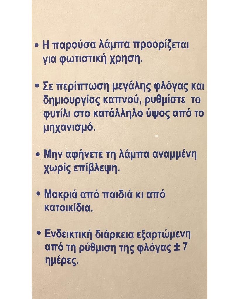 Απολαύστε μοναδική ατμόσφαιρα με την παραδοσιακή λάμπα παραφινέλαιου, ιδανική για ρομαντικές βραδιές, εξοχικές κατοικίες και διακοσμητικές συνθέσεις. Αποκτήστε την τώρα!
