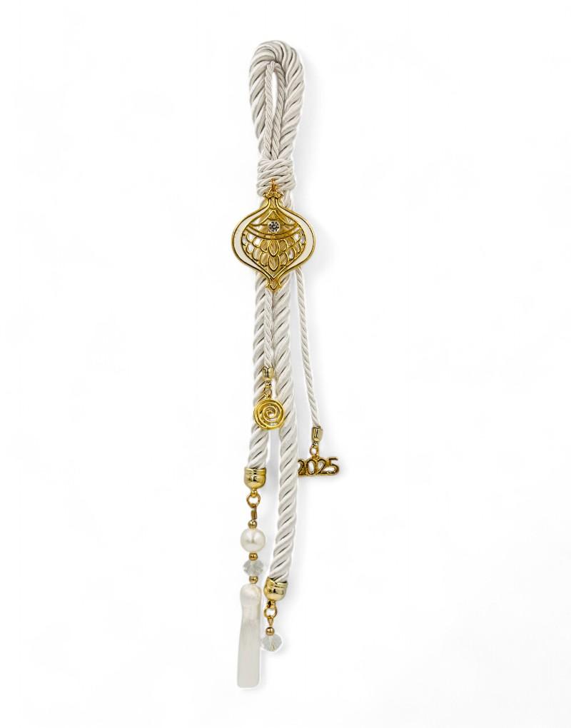 Γούρι λευκό με ρόδι, φτιαγμένο με προσοχή στη λεπτομέρεια. Διαθέτει λευκό χρώμα που συμβολίζει καθαρότητα και νέες αρχές, ρόδι ως σύμβολο αφθονίας και ευτυχίας, χοντρό κορδόνι για σταθερότητα και αντοχή, και όμορφα διακοσμητικά στοιχεία που δημιουργούν μία αριστοκρατική εμφάνιση.