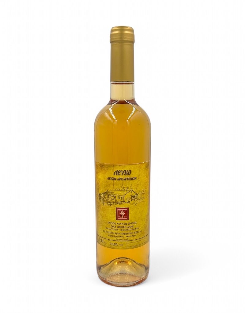 Ένας εκλεκτός λευκός οίνος ξηρός που συνδυάζει τη φρεσκάδα της Μαλαγουζιάς με τα αρωματικά χαρακτηριστικά του Μοσχάτου Σάμου. Τα σταφύλια συλλέγονται με φροντίδα από τους μοναχούς του Ιερού Κελιού Αγίων Αρχαγγέλων Σαββαΐων, από τα ευλογημένα αμπέλια του Κελιού, όπου καλλιεργούνται με σεβασμό στη φύση και την παράδοση του Αγίου Όρους.