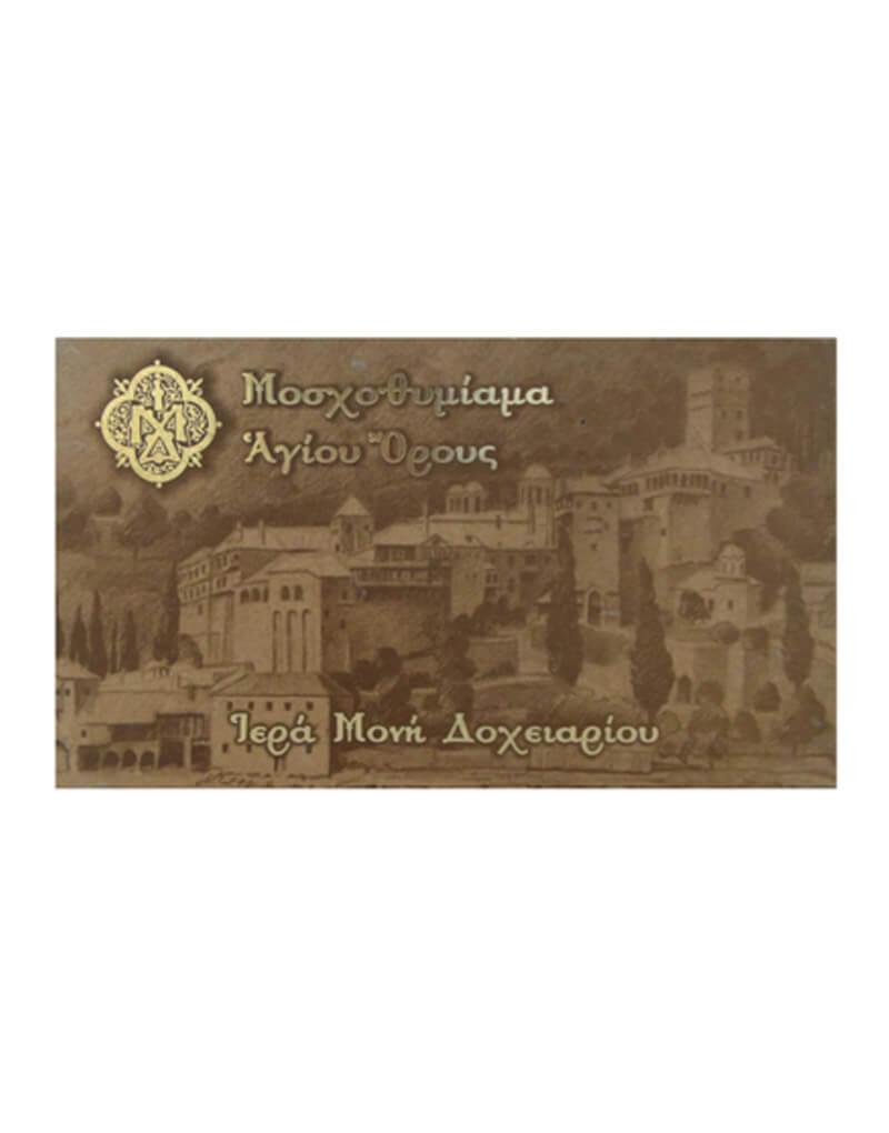 Εξαιρετικής ποιότητας χειροποίητο αγιορείτικο μοσχοθυμίαμα, παραδοσιακά παρασκευασμένο από τους μοναχούς της Ιεράς Μονής Δοχειαρίου στο Άγιον Όρος, φτιαγμένο με μεράκι και προσευχή. Με έντονο άρωμα που διαρκεί κατά την καύση του.