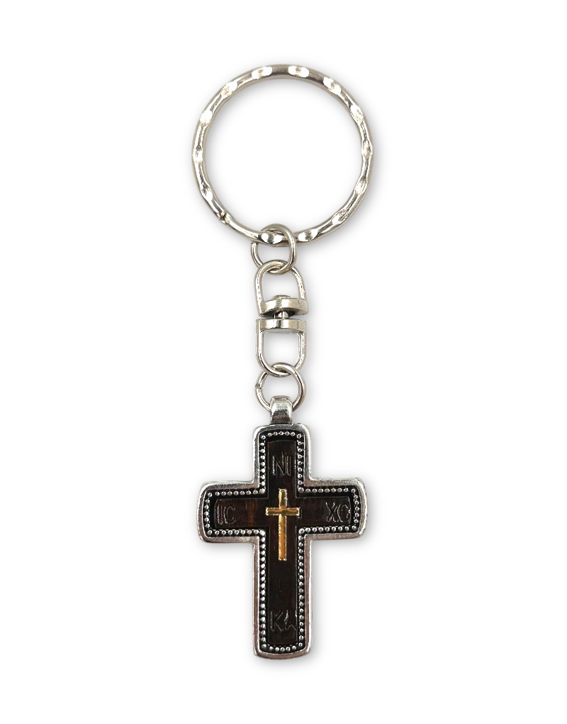 Ένα μοναδικό μπρελόκ σταυρός, που συνδυάζει ξύλινο εσωτερικό και ανθεκτικό μεταλλικό πλαίσιο για κομψότητα και αντοχή. Στην μπροστινή πλευρά είναι χαραγμένο το ιερό σύμβολο ICXC NIKA, ενώ στην πίσω πλευρά αναγράφεται η ευχή “Κύριε Ιησού Χριστέ ελέησόν με”. Ένα υπέροχο πνευματικό σύμβολο, ιδανικό για καθημερινή χρήση ή ως δώρο.