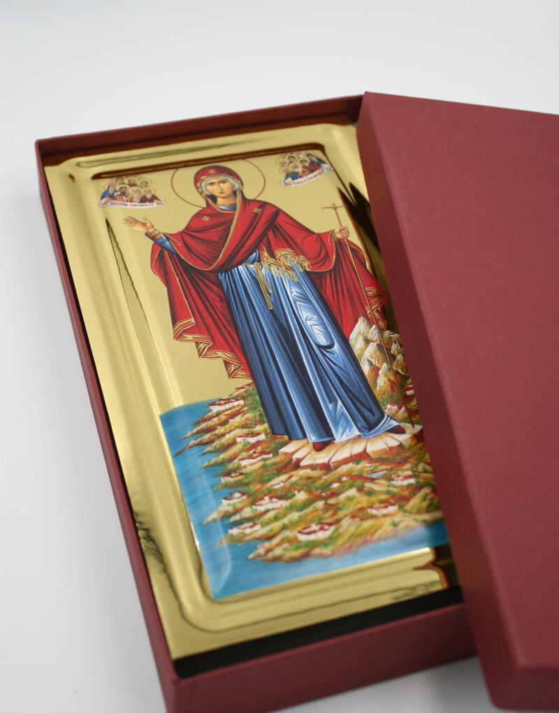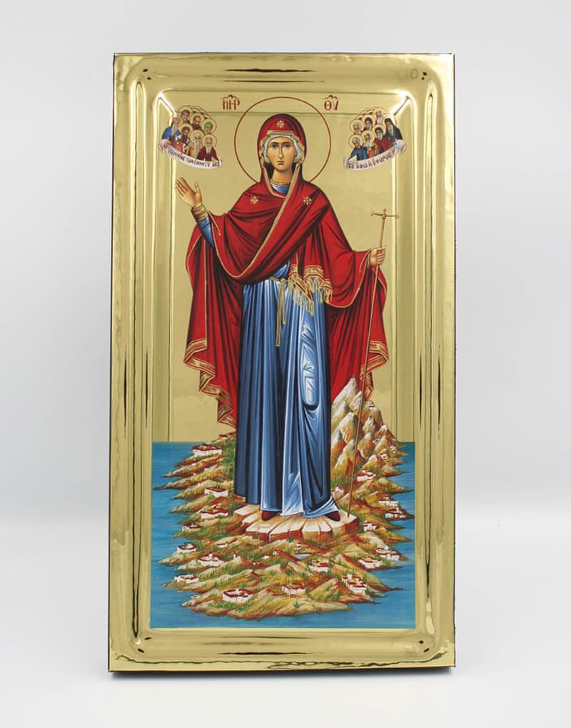 Η Παναγία Αθωνίτισσα σε μια χειροποίητη ένσκαπτη εικόνα με “εφέ” στιλβωτού.