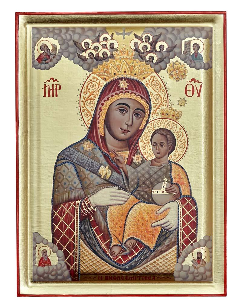 Μοναδική χειροποίητη ένσκαπτη εικόνα με την Παναγία Βηθλεεμίτισσα. Η εικόνα είναι μεταξοτυπίας εκτυπωμένη πάνω σε επιχρυσωμένο καμβά. Συνοδεύεται στο πίσω μέρος από πιστοποιητικό γνησιότητας σφραγισμένο από βουλοκέρι. Επίσης μπορείτε εύκολα να κρεμάσετε την εικόνα στον τοίχο μέσω της ειδικής οπής που διαθέτει. Συμπεριλαμβάνεται κουτί πολυτελείας, ιδανικό δώρο για γάμους και τάμματα. Εντός της μεγαλοπρεπούς Βασιλικής της του Χριστού Γεννήσεως στη Βηθλεέμ ξεχωρίζει η θαυματουργός εικόνα της Υπεραγίας Θεοτόκου, της επονομαζόμενης Βηθλεεμίτισσας. Η ιερή εικόνα της Παναγίας Βηθλεεμίτισσας είναι η εφέστιος εικόνα της Βασιλικής της Γεννήσεως του Χριστού στη Βηθλεέμ και βρίσκεται τοποθετημένη σε περίοπτο προσκυνητάριο, στη δεξιά πλευρά της νοτίου εισόδου του αγίου Σπηλαίου της Γεννήσεως. Η άπειρη στοργή, που ξεχειλίζει από τα μάτια της εικόνας της Παναγίας, και το γαλήνιο βλέμμα της, γλυκαίνουν και ευφραίνουν τις καρδιές των πιστών. Αντίστοιχα ο ρουχισμός της εικόνας της Θεοτόκου, που είναι καλυμμένος με πολυτελή υφάσματα και πολύτιμα πετράδια, προκαλούν ιδιαίτερη εντύπωση. Η εικόνα της Παναγίας είναι, στη συνείδηση των πιστών, πάντα σεβαστή και αγαπημένη, αλλά προσιτή και όχι απόμακρη. Ζει στις καρδιές των ανθρώπων, στα εικονοστάσια των σπιτιών, στα καλντερίμια των νησιών τους, στις πλαγιές των βουνών. Πάντα και παντού, η γυναικεία, οικεία μορφή που παρηγορεί, θεραπεύει, προστατεύει, αγρυπνά. Το όνομά της βρίσκεται στο στόμα του λαού, σε κάθε παράκληση ή ικεσία και σε κάθε δοξολογία. Συνοδοιπόρος στη χαρά και αρωγός στη λύπη, η Παναγία έχει περάσει και έχει ζυμωθεί στη συνείδηση των πιστών σαν κομμάτι της καθημερινότητάς τους. Για τις εικόνες με Διάσταση χ19 και 18,5χ25 : μπορείτε να την στηρίξετε πάνω σε οποιαδήποτε επιφάνεια χάρη στο ξύλινο ποδαράκι της. Για την εικόνα με Διάσταση 28χ 38 : διαθέτει δερμάτινο σχοινάκι έτσι ώστε να μπορείτε εύκολα να κρεμάσετε την εικόνα.