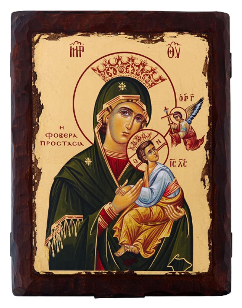 Μοναδική ξυλόγλυπτη παλαιωμένη εικόνα, χειροποίητη και σκαλισμένη με σκαρπέλο με την Παναγία Φοβερά Προστασία. Η εικόνα είναι μεταξοτυπίας εκτυπωμένη πάνω σε επιχρυσωμένο καμβά. Συνοδεύεται στο πίσω μέρος από πιστοποιητικό γνησιότητας σφραγισμένο από βουλοκέρι. Μπορούμε να τοποθετήσουμε την εικόνα της αρεσκείας σας, κατόπιν επικοινωνίας μαζί μας. Επίσης διαθέτει δερμάτινο σχοινάκι έτσι ώστε να μπορείτε εύκολα να κρεμάσετε την εικόνα.