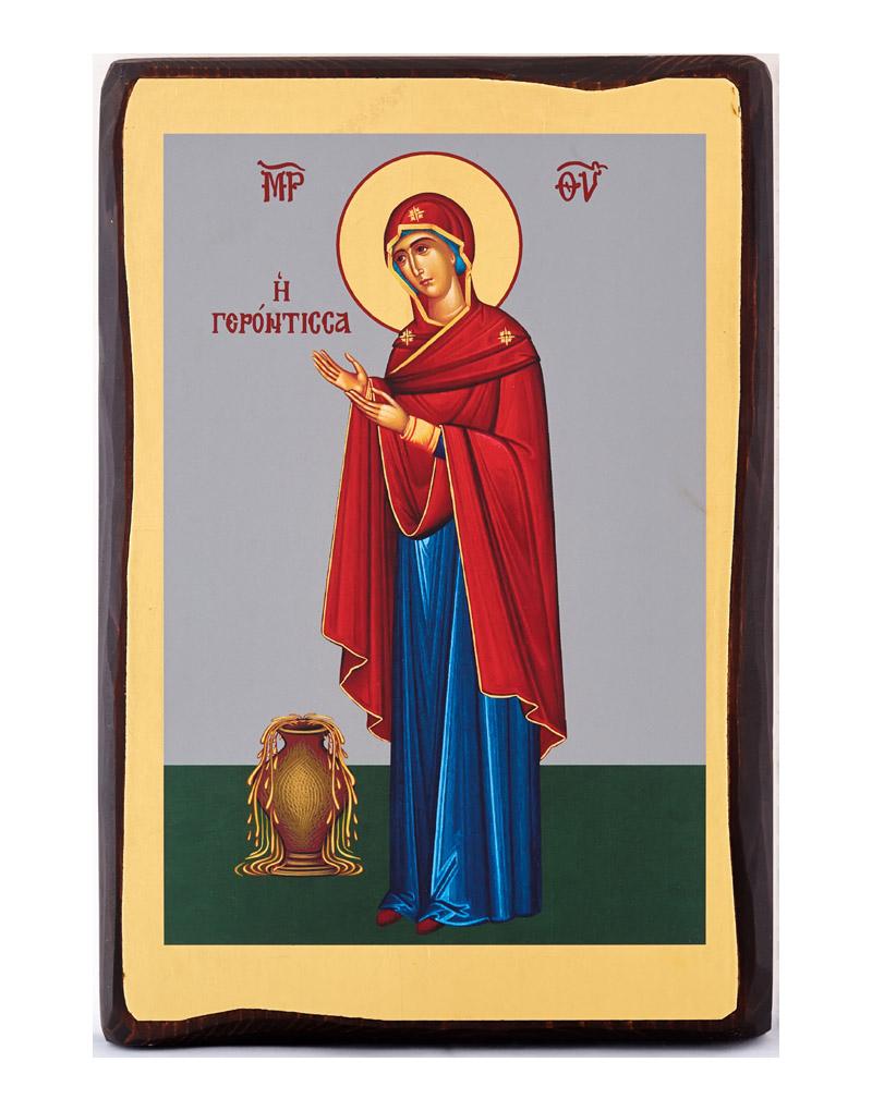 Η θαυματουργός εικόνα της Παναγίας της «Γερόντισσας» βρίσκεται στην Ιερά Μονή Παντοκράτορος του Αγίου Όρους και είναι εφέστια εικόνα του Μοναστηρίου. Είναι αντίγραφο της ψηφιδωτής εικόνος της Παναγίας Γοργοεπηκόου, που βρισκόταν στη μονή Παντοκράτορος της Κωνσταντινουπόλεως. Η μορφή της είναι στη θέα γλυκύτατη, ευχάριστη και γεμάτη έλεος, αφήνοντας στον κάθε προσκυνητή αισθήματα χαράς, ευφροσύνης, αγαλλιάσεως, ελπίδας, παρηγοριάς και ευσπλαχνίας, δείχνοντας ότι προστρέχει στην ανάγκη των τέκνων Της και ότι πάντοτε παραμυθεί τους πιστούς Της.