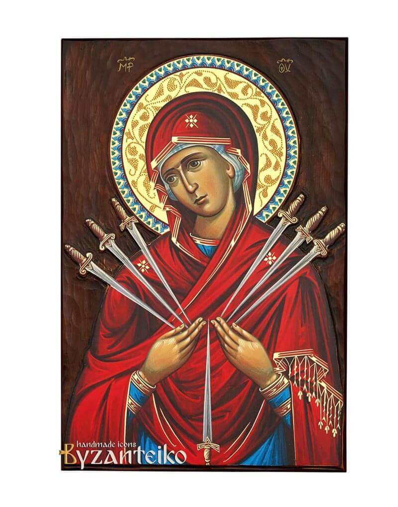 Απεικονίζει την Μητέρα του Θεού με τα επτά σπαθιά, ή θλίψεις, με τρεις λόγχες ή σπαθιά στον δεξιό ώμο και τρεις στον αριστερό και ένα σπαθί να τρυπάει την καρδιά της από κάτω. Στην Αγία Γραφή, ο αριθμός επτά, συνήθως δηλώνει την πληρότητα και την αφθονία. Σε αυτήν την περίπτωση όμως έχουμε την πληρότητα των απέραντων θλίψεων, του πόνου της καρδιάς, που ένιωσε η Θεοτόκος στην διάρκεια της επιγείου ζωής της.