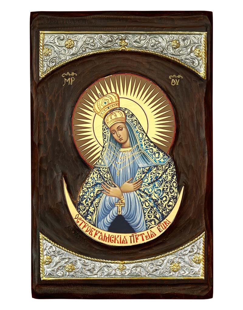 Η Παναγία των Άστρων – Οστρομπράμσκα σε μοναδική ξυλόγλυπτη εικόνα με μεταλλικό διάκοσμο, χειροποίητη και σκαλισμένη με σκαρπέλο.