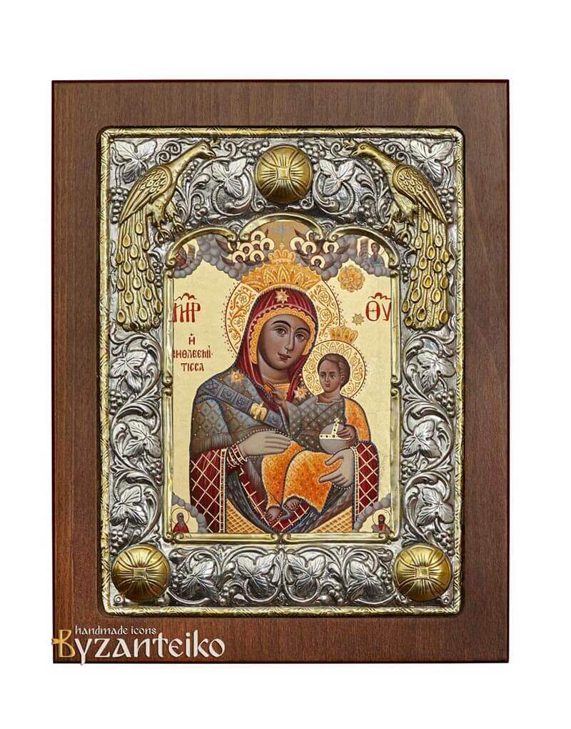 Χειροποίητη εικόνα μεταξοτυπίας εκτυπωμένη πάνω σε επιχρυσωμένο καμβά, διακοσμημένη με μεταλλικό πλαίσιο που παραμένει αναλλοίωτο στο πέρασμα των χρόνων. Συνοδεύεται στο πίσω μέρος από πιστοποιητικό γνησιότητας σφραγισμένο από βουλοκέρι. Επίσης διαθέτει δερμάτινο σχοινάκι έτσι ώστε να μπορείτε εύκολα να την κρεμάσετε καθώς και ποδαράκι στήριξης για να μπορείτε να την στήσετε σε οποιαδήποτε επιφάνεια.