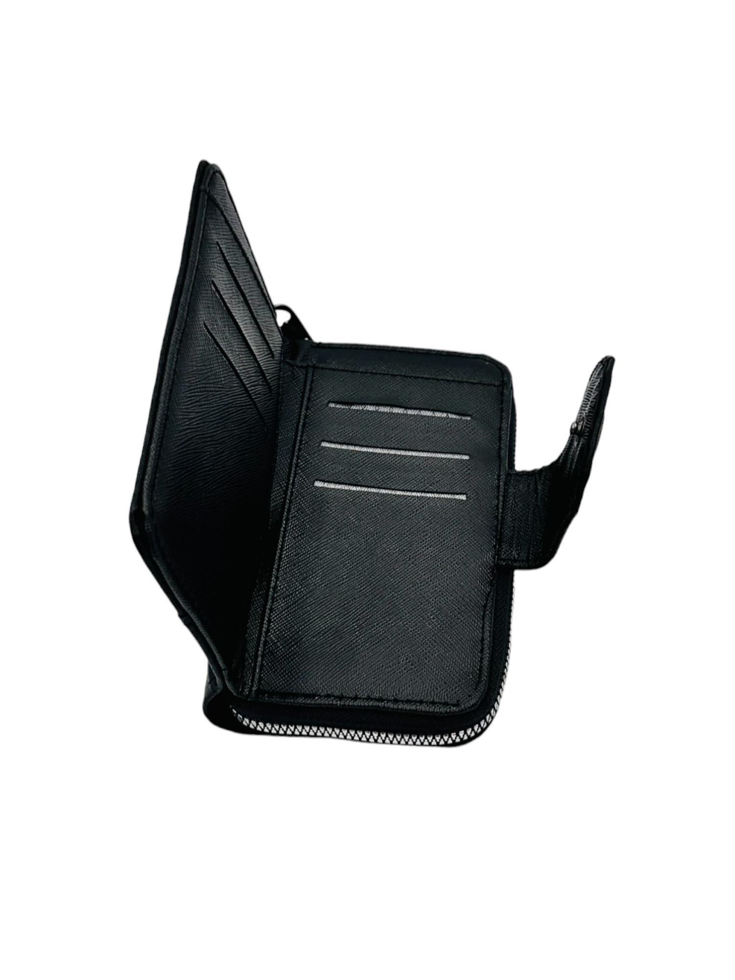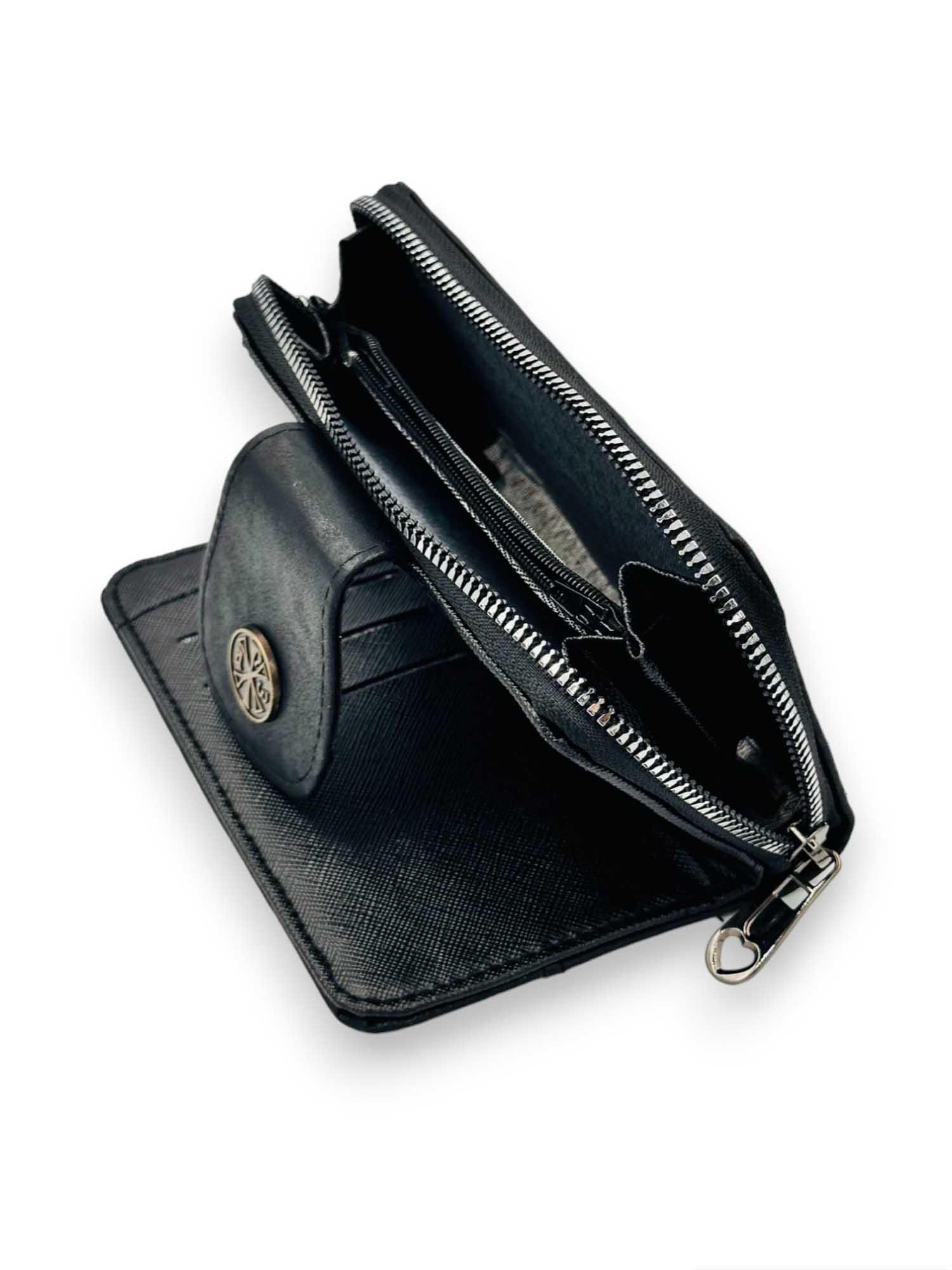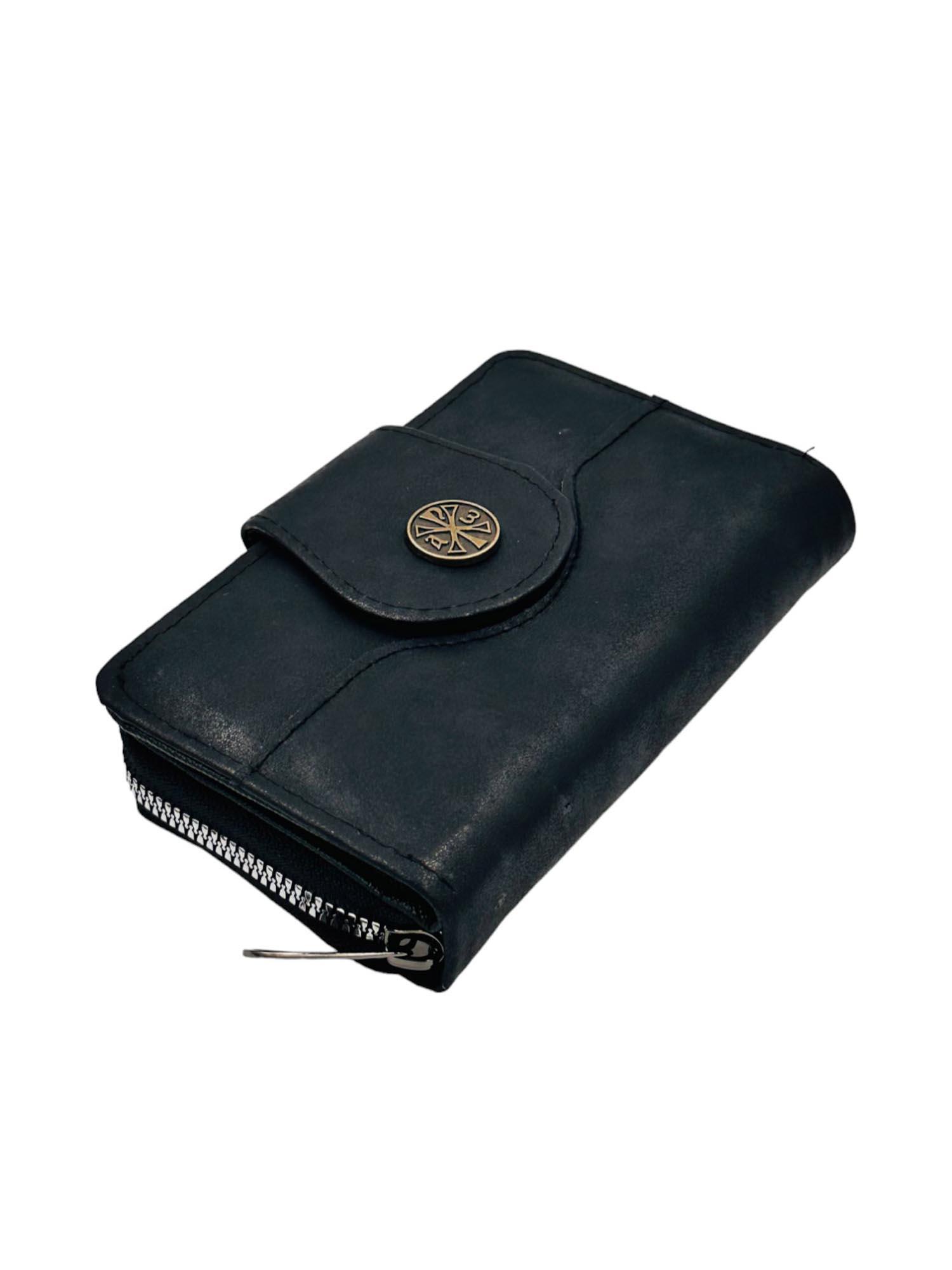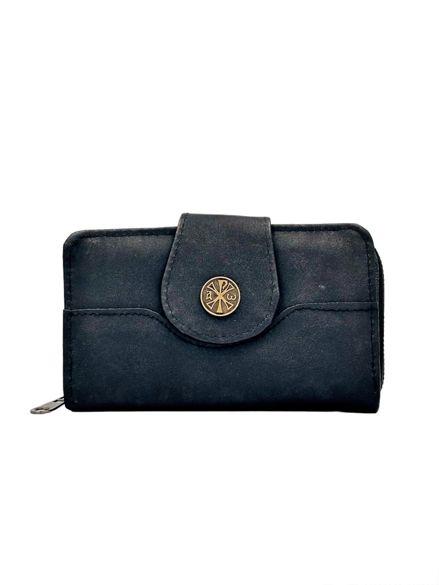 Πορτοφόλι γυναικείο δερμάτινο σε μαύρο χρώμα με θήκες που θα σας βολέψουν να τακτοποιήσετε με άνεση τα προσωπικά σας αντικείμενα, τις κάρτες σας και τα χρήματα σας. Κατασκευάζεται από δέρμα και στο κέντρο φέρει το σήμα του Ιησού Χριστού.