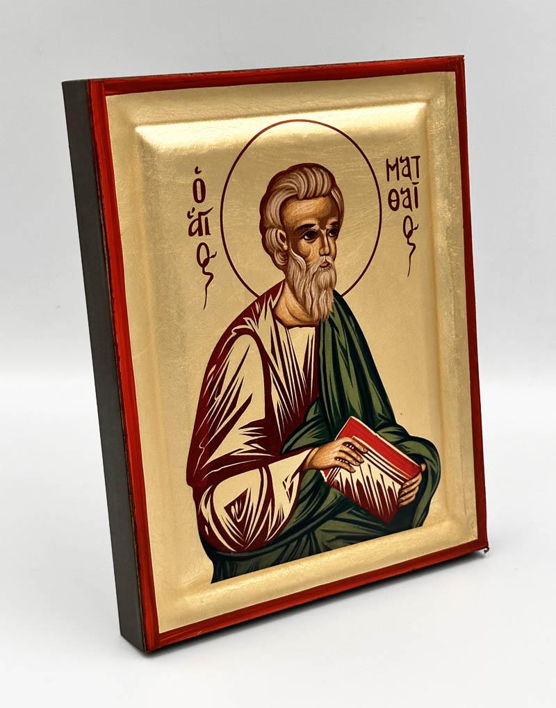 Ο Άγιος Απόστολος Ματθαίος ο Ευαγγελιστής σε μια μοναδική χειροποίητη ένσκαπτη εικόνα μεταξοτυπίας εκτυπωμένη πάνω σε επιχρυσωμένο καμβά.
