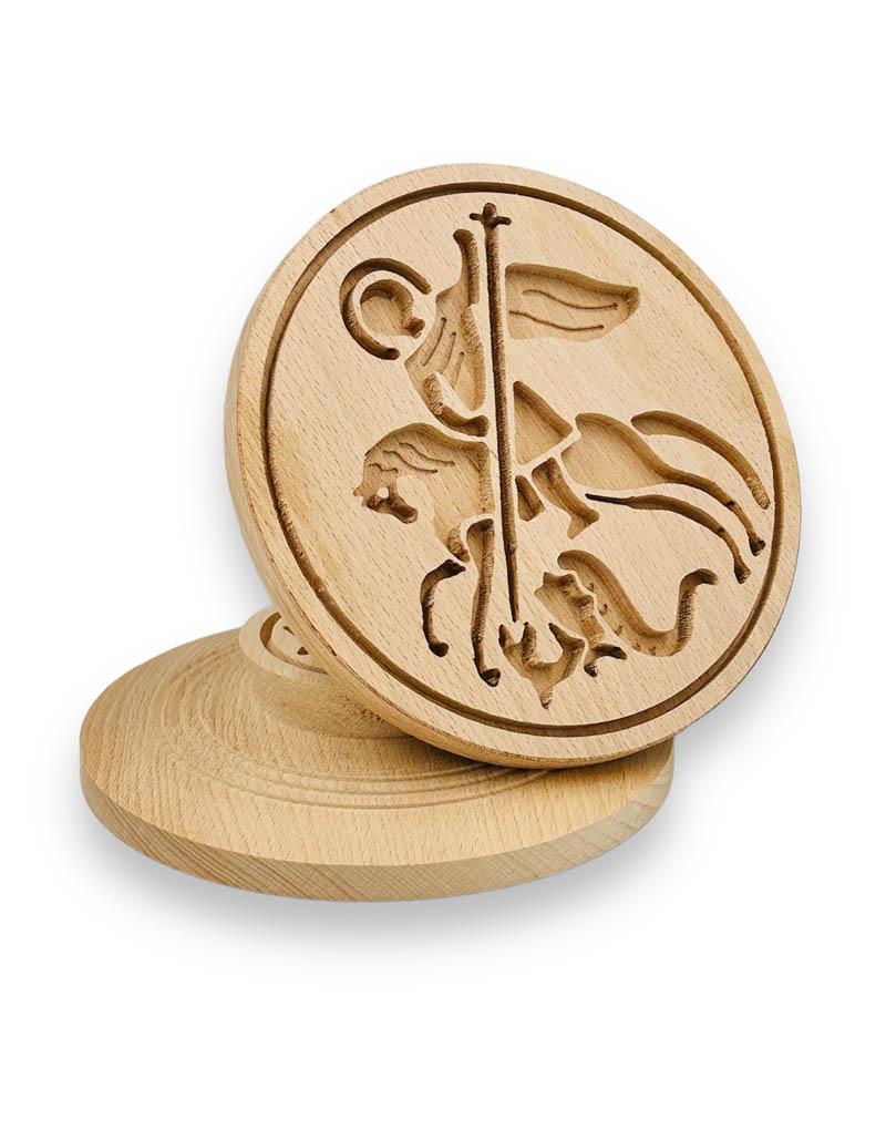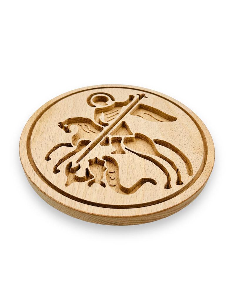 Σφραγίδα προσφόρου με τον Άγιο Γεώργιο Τροπαιοφόρο από φυσικό ξύλο οξιάς με διάμετρο 16,5 εκατοστά. Η σφραγίδα είναι εξαιρετικής ποιότητας και με βαθύ σκάλισμα, αποτέλεσμα του οποίου είναι να αποτυπώνεται άψογα το σχέδιο πάνω στο πρόσφορο. Στο πίσω μέρος διαθέτει λαβή επίσης με βαθύ σκάλισμα με το ICXC NIKA.