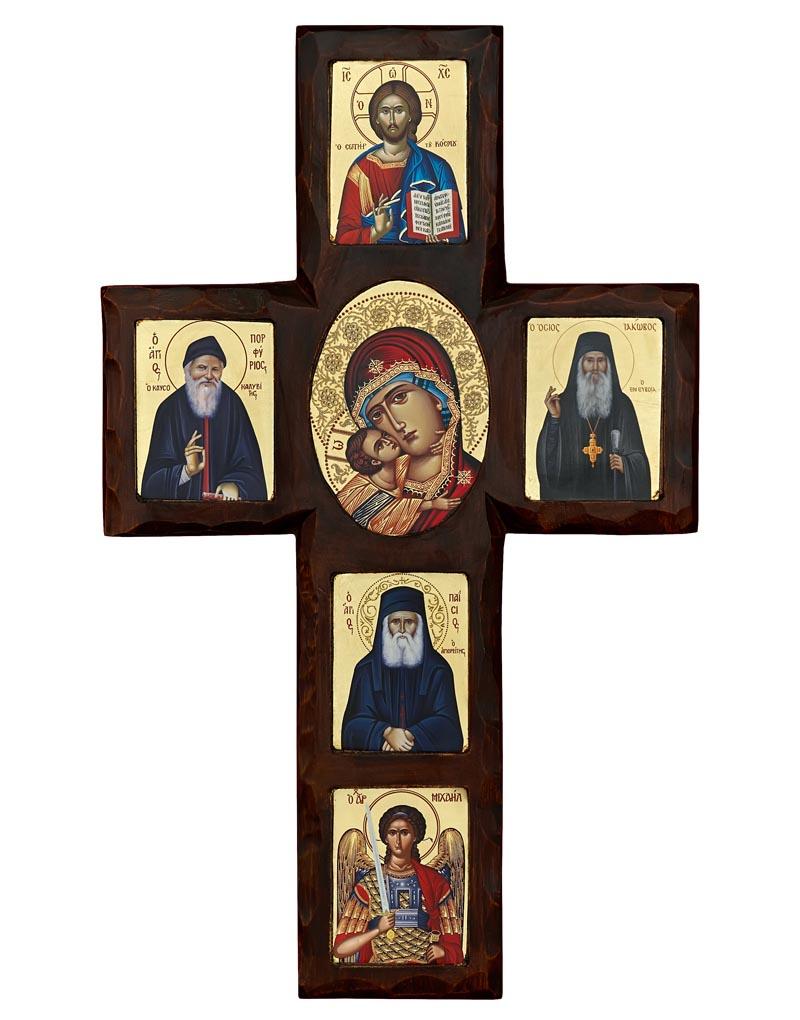 Μοναδικός σταυρός σκαλιστός, ο οποίος αποτελείται από έξι εικόνες με την μεσαία σε οβάλ σχήμα. Απεικονίζονται ο Ιησούς Χριστός Σωτήρ του Κόσμου, η Παναγία Γλυκοφιλούσα, ο Αρχάγγελος Μιχαήλ, ο Άγιος Πορφύριος, ο Άγιος Παΐσιος και ο Όσιος Ιάκωβος. Υπάρχει η δυνατότητα να τοποθετηθούνε οι εικόνες της αρεσκείας σας. Ο σταυρός είναι χειροποίητος και σκαλισμένος με σκαρπέλο και οι εικόνες είναι μεταξοτυπίας εκτυπωμένες πάνω σε επιχρυσωμένο καμβά. Συνοδεύεται στο πίσω μέρος από πιστοποιητικό γνησιότητας σφραγισμένο από βουλοκέρι. Επίσης διαθέτει δερμάτινο σχοινάκι έτσι ώστε να μπορείτε εύκολα να κρεμάσετε την εικόνα.
