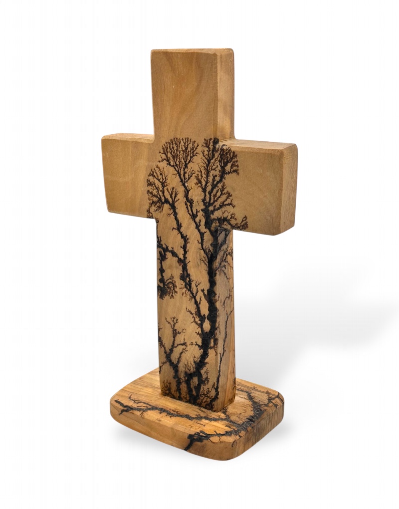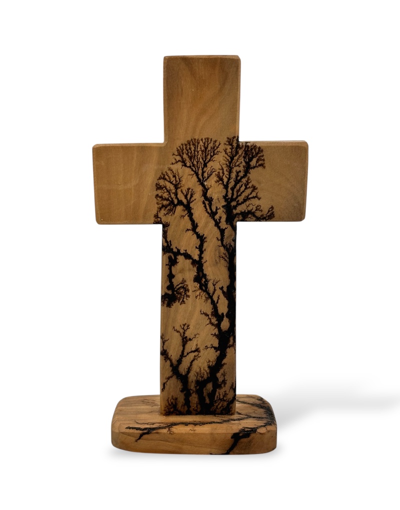 Αυτός ο χειροποίητος επιτραπέζιος σταυρός από ξύλο ελιάς είναι διακοσμημένος με την ιδιαίτερη τεχνική της πυρογραφίας μέσω ηλεκτρισμού. Κάθε κομμάτι είναι μοναδικό, καθώς τα φυσικά νερά του ξύλου συνδυάζονται με τα μοναδικά σχέδια που δημιουργούνται από την επίδραση του ηλεκτρισμού.
