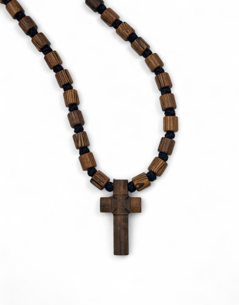 Ξύλινος σταυρός λαιμού με ξύλινες χάντρες και χειροποίητους κόμπους από κηροκλωστή.